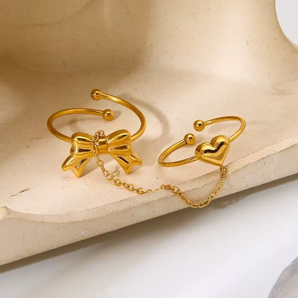 Un set di anelli in acciaio inossidabile dal design dolce e raffinato, pensato per chi ama accessori femminili con un tocco creativo. I due anelli aperti presentano charm scolpiti — un fiocco elegante e un cuore dal profilo morbido — collegati da una sottile catenina che aggiunge movimento e un’estetica ricercata. Un accessorio unico, perfetto per esprimere romanticismo con stile contemporaneo.