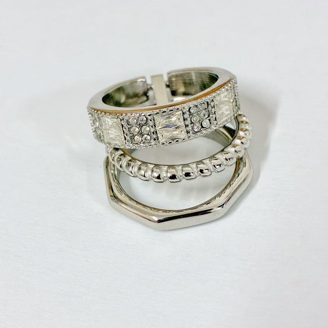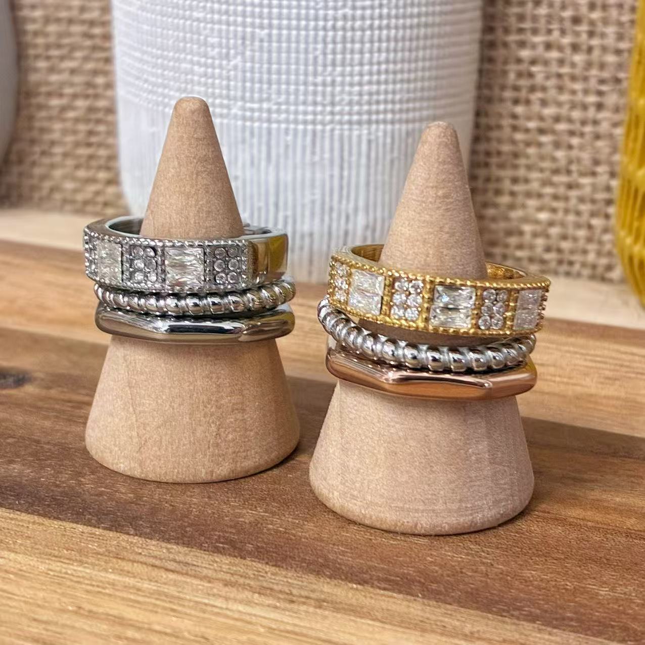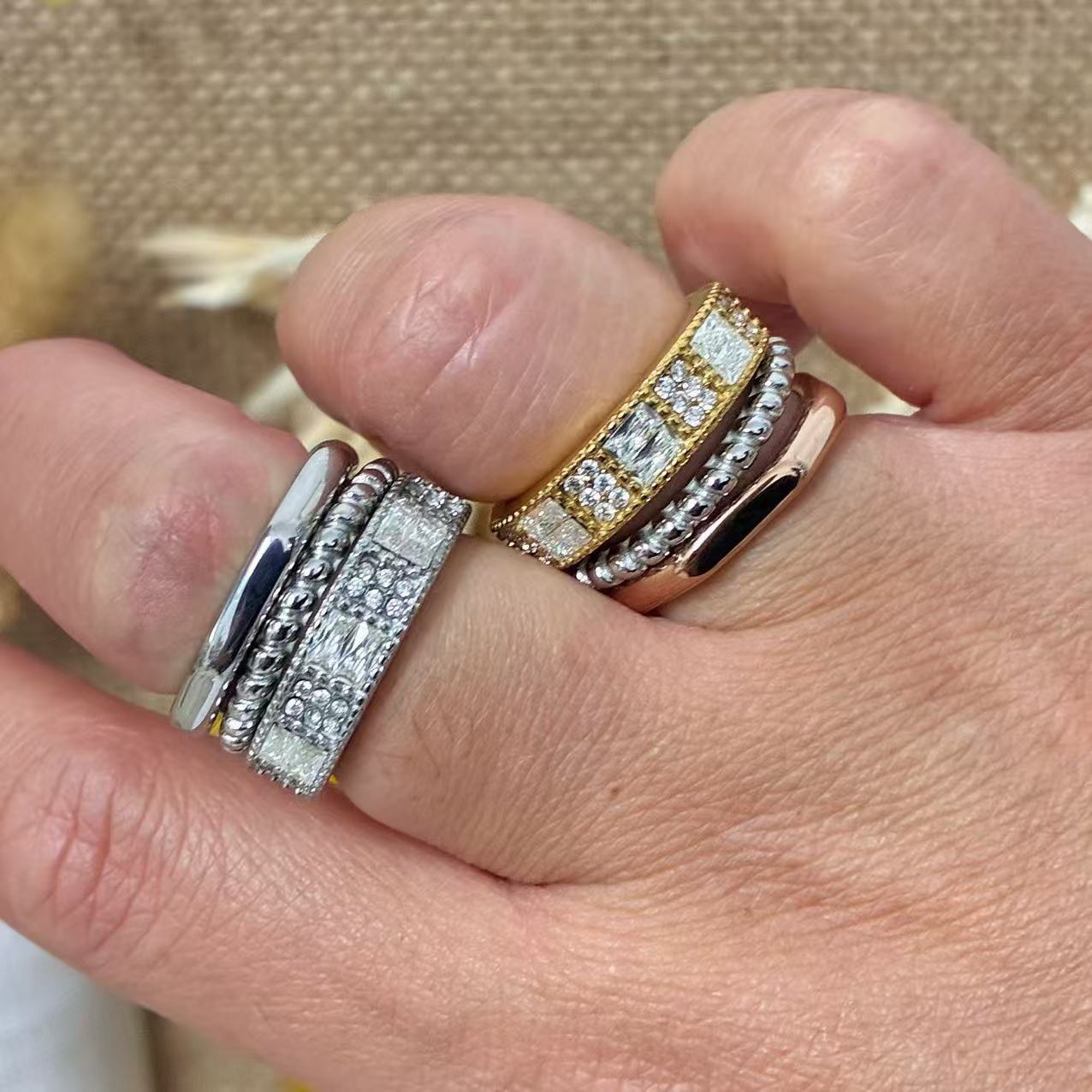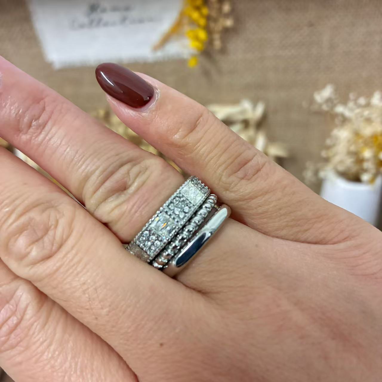Un set raffinato che unisce tre anime diverse in unāunica armonia: la fascia tempestata di zirconi brillanti, lāanello a sfere che dona movimento e quello geometrico dal profilo deciso. In acciaio inossidabile, questi anelli catturano la luce con ogni gesto, diventando protagonisti assoluti di uno stile elegante e contemporaneo.