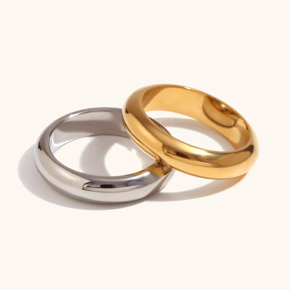 Una coppia di anelli dal design pulito e senza tempo, pensata per celebrare l’equilibrio tra semplicità e presenza. Le superfici lisce e bombate riflettono la luce con naturalezza, creando un effetto elegante e sobrio che si adatta a ogni stile.