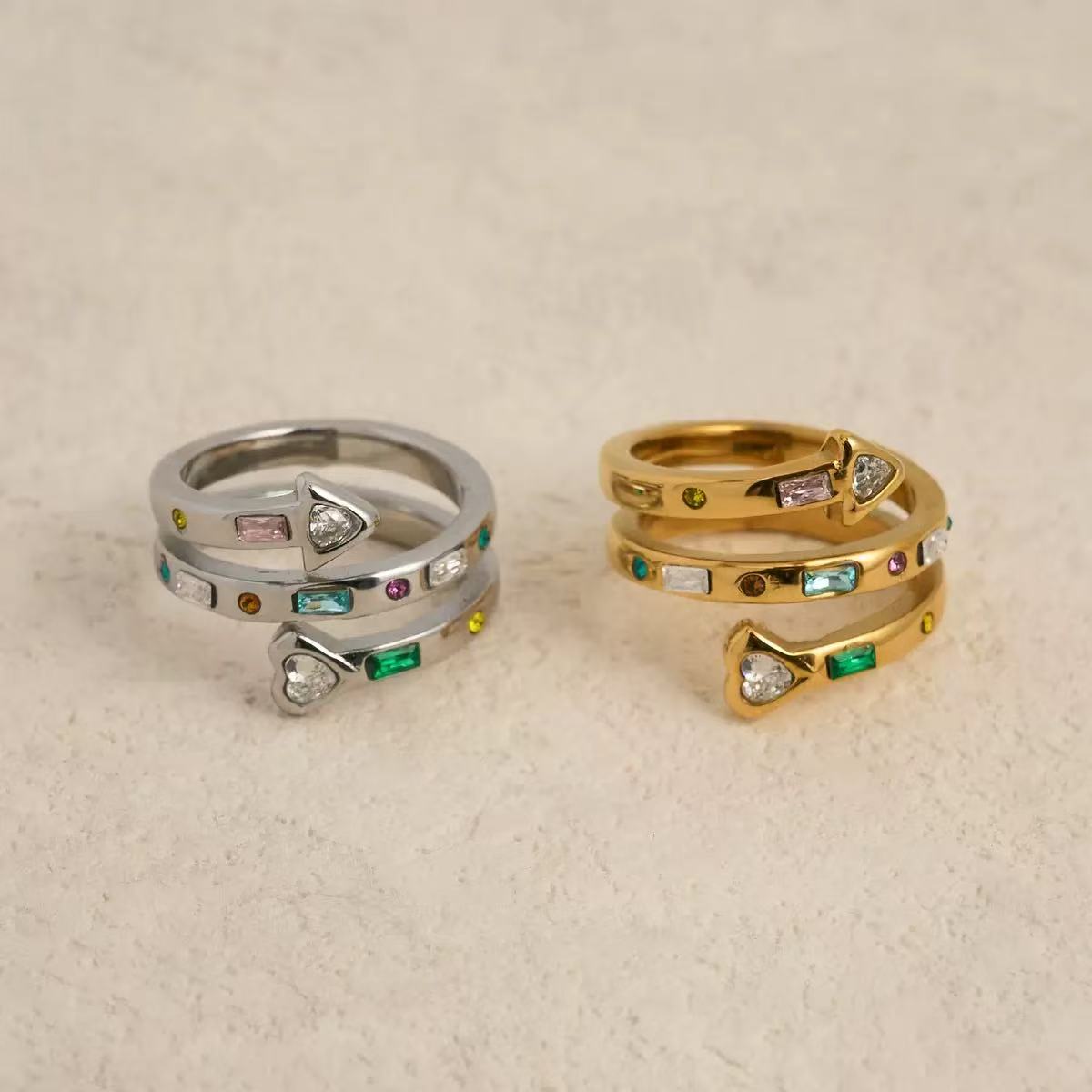Questo anello avvolgente unisce un design moderno a dettagli luminosi che catturano l’attenzione. Le estremità a forma di freccia, impreziosite da zirconi lucenti, creano un effetto dinamico e simbolico, mentre le gemme multiformi applicate lungo la fascia aggiungono un tocco di vivacità e stile.