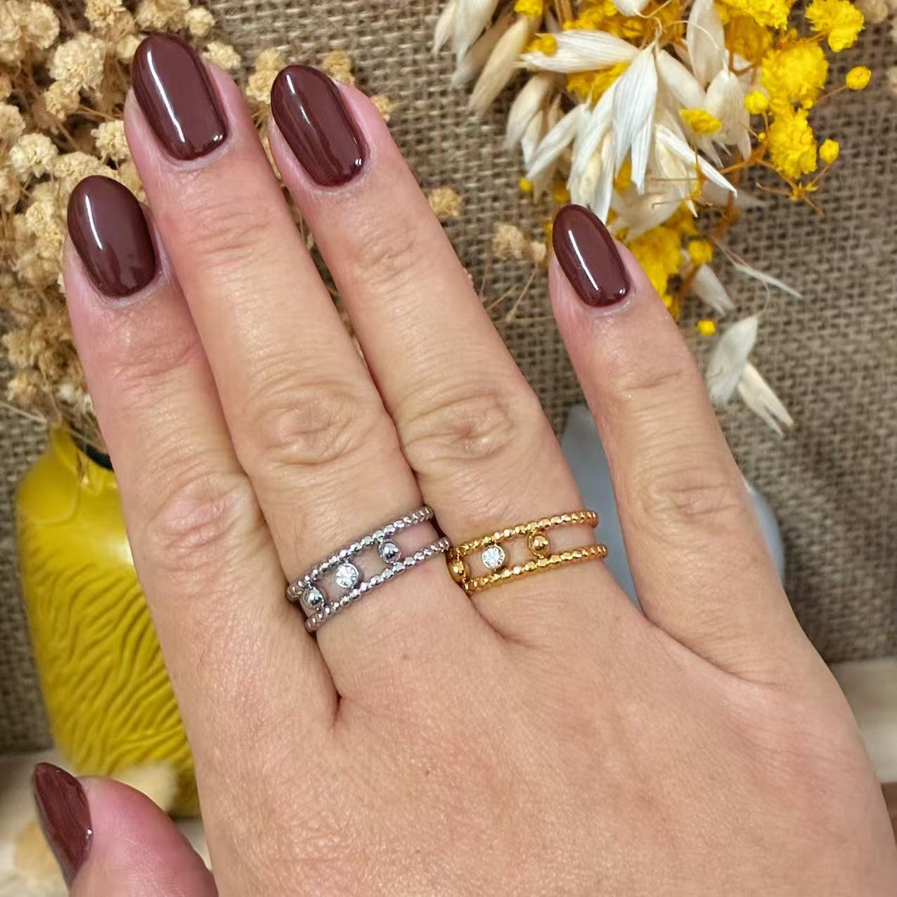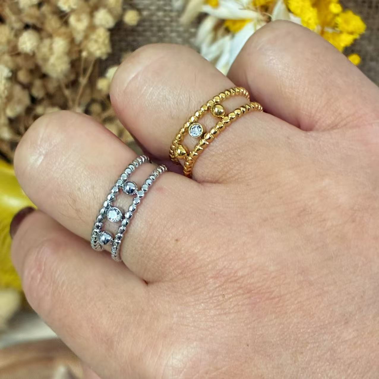 Un anello che ricorda la delicatezza di una piccola corona, con doppio cerchio di sfere lavorate e cristalli incastonati. Disponibile in versione dorata o argentata, è il dettaglio perfetto per chi ama accessori eleganti ma non troppo appariscenti.