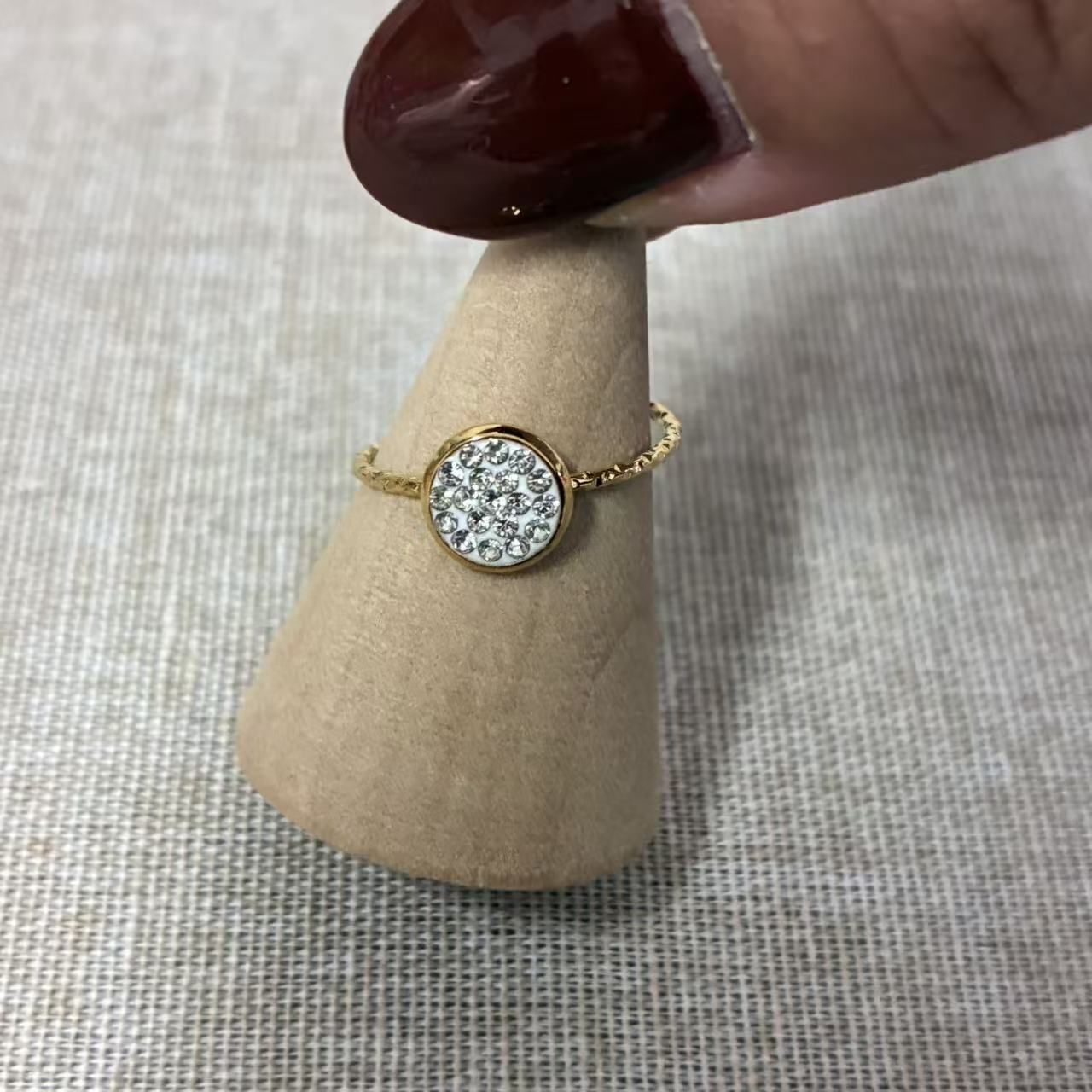 Un gioiello minimalista ma di grande impatto: al centro un disco luminoso impreziosito da cristalli scintillanti, disponibile in tre varianti di colore – viola intenso, nero elegante e bianco brillante. La fascia intrecciata placcata oro aggiunge un tocco raffinato, rendendo ogni anello unico. Realizzato in acciaio inossidabile, resistente e ipoallergenico, perfetto per un uso quotidiano con stile.