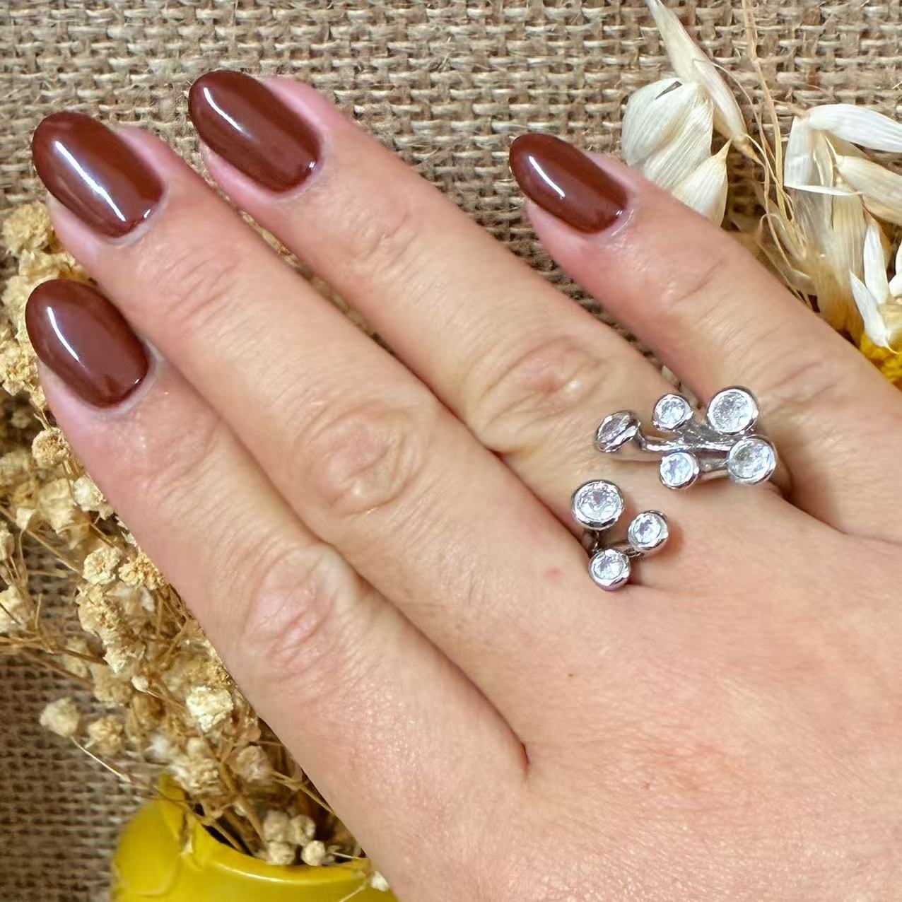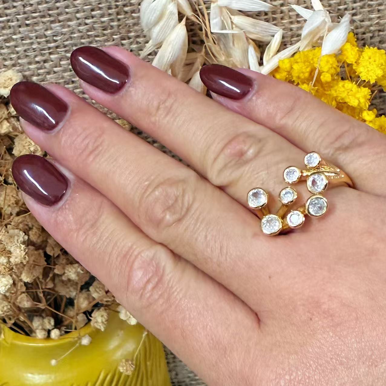 Un design ispirato alle costellazioni: questo anello aperto con più zirconi incastonati sembra catturare le stelle nel cielo notturno. Disponibile in versione dorata o argentata, dona un tocco luminoso e sofisticato a ogni look.