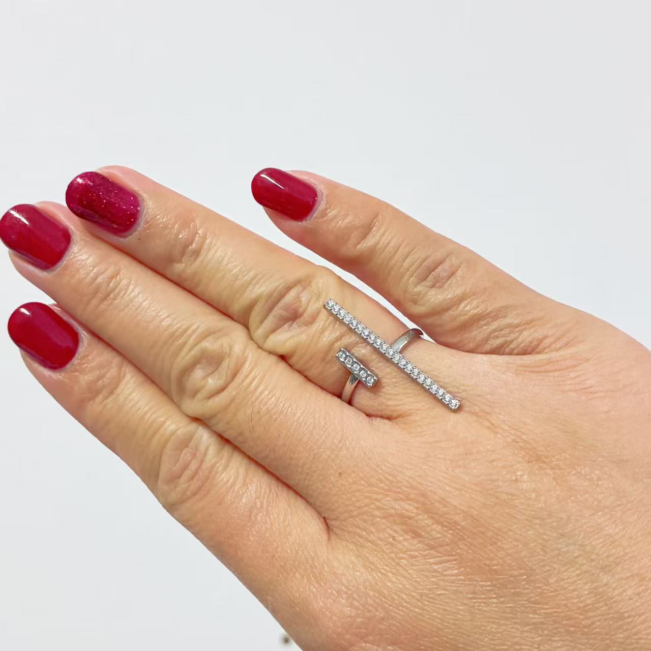 Un anello dal carattere contemporaneo, perfetto per chi ama lo stile moderno e deciso. Il design aperto è caratterizzato da due barre lineari parallele, entrambe ricoperte da piccoli cristalli luminosi che creano un effetto elegante e scintillante.