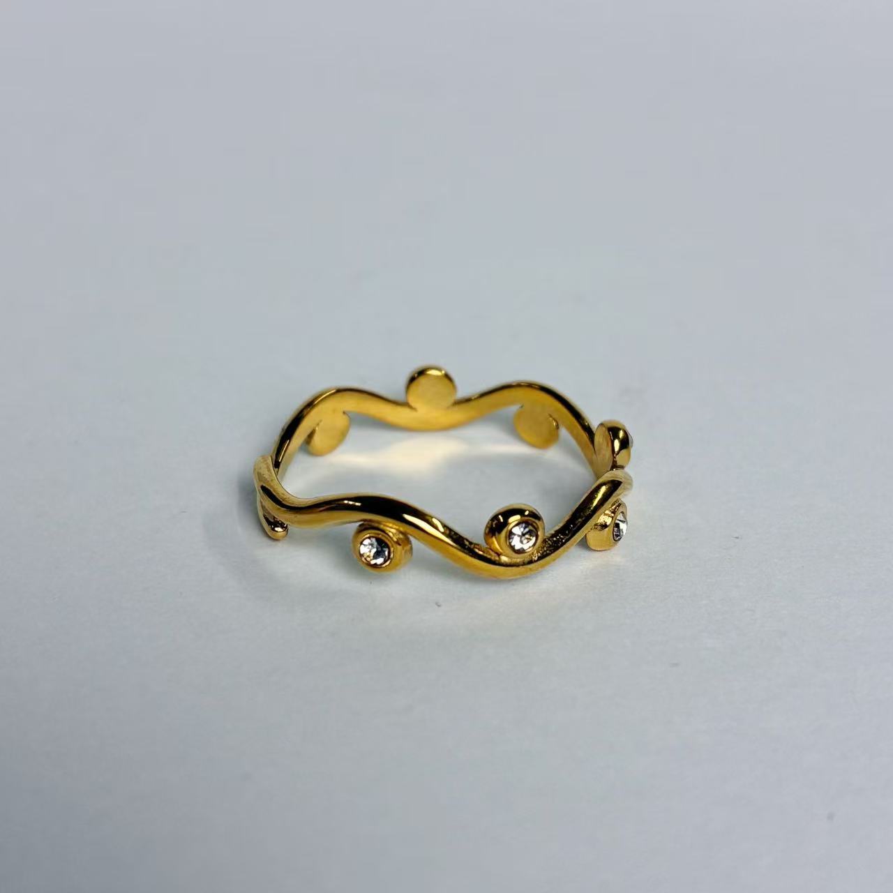 Un anello dal design fluido e contemporaneo, caratterizzato da una doppia linea ondulata dorata impreziosita da piccoli cristalli incastonati come punti luce.