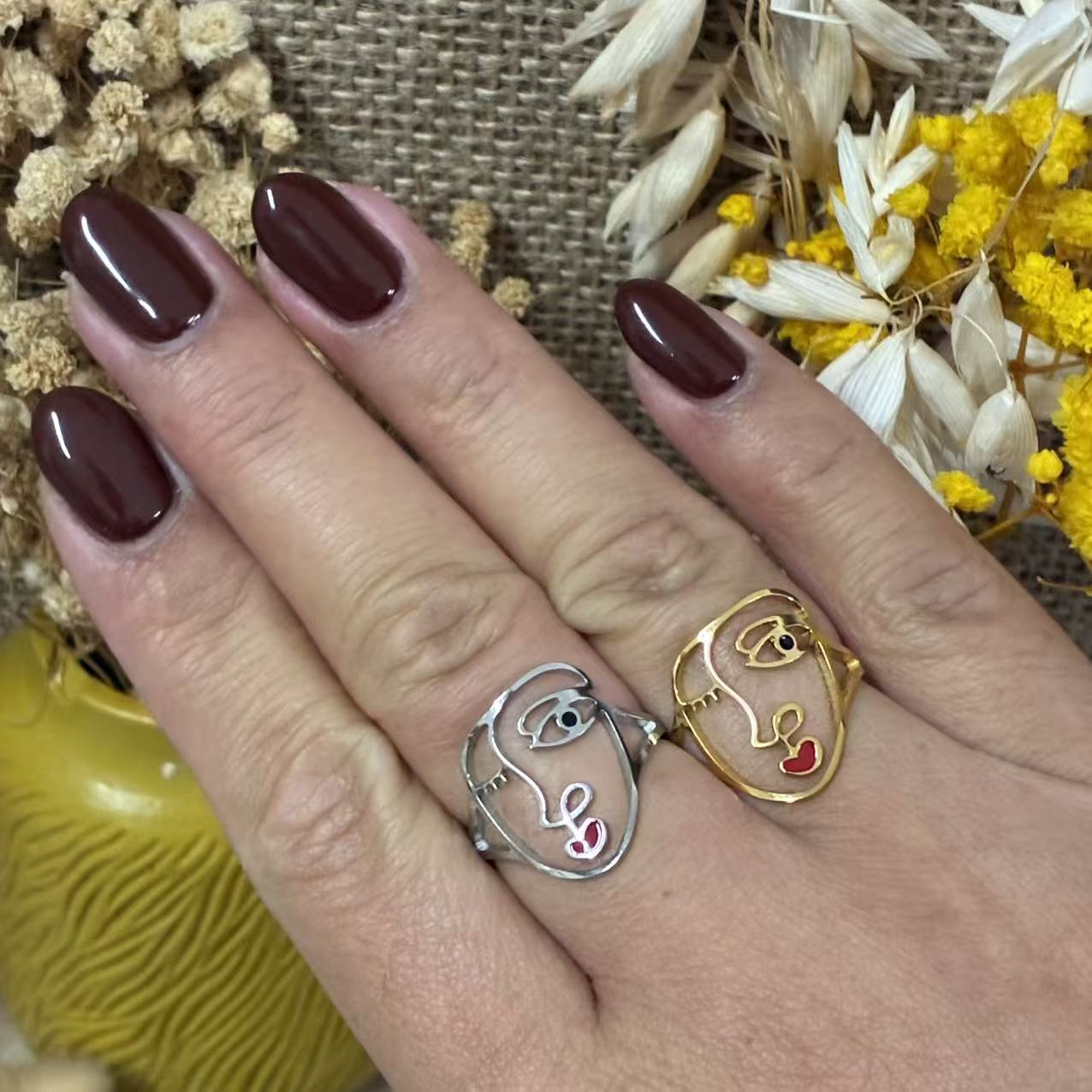 Un gioiello che unisce arte e moda: questo anello con design a volto stilizzato, ispirato all’arte moderna, cattura l’attenzione con i suoi dettagli unici. Le labbra rosse smaltate e l’occhio scuro creano un contrasto vivace che dona carattere e originalità. Disponibile in versione dorata o argentata.
