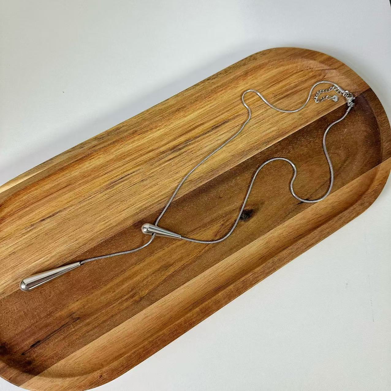 (C124)Collana saliscendi gocce allungate in acciaio inox
