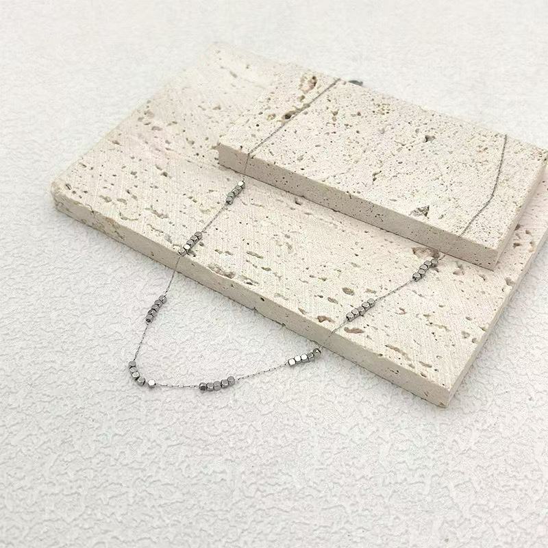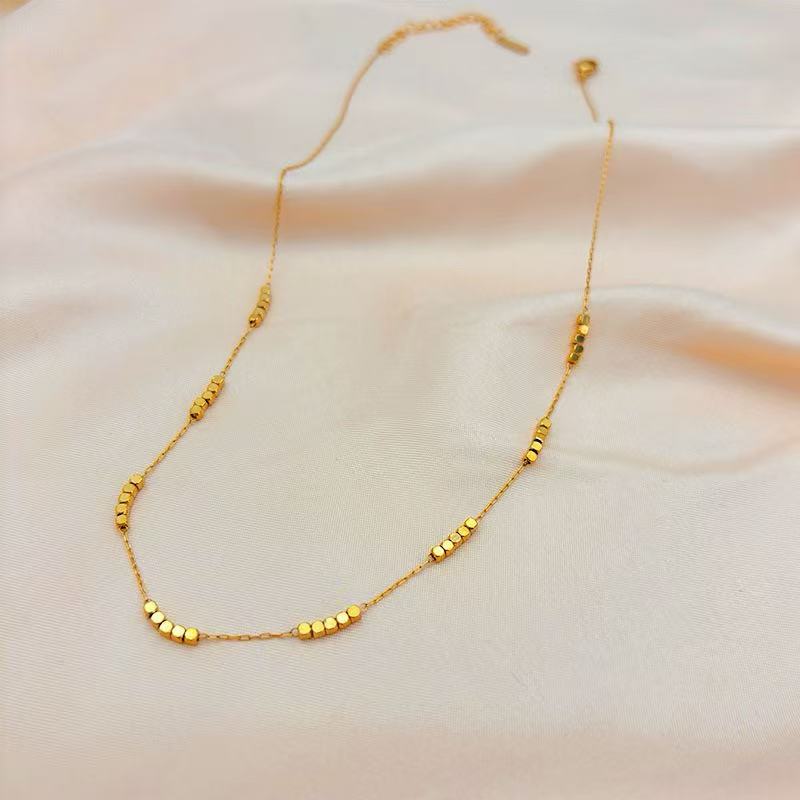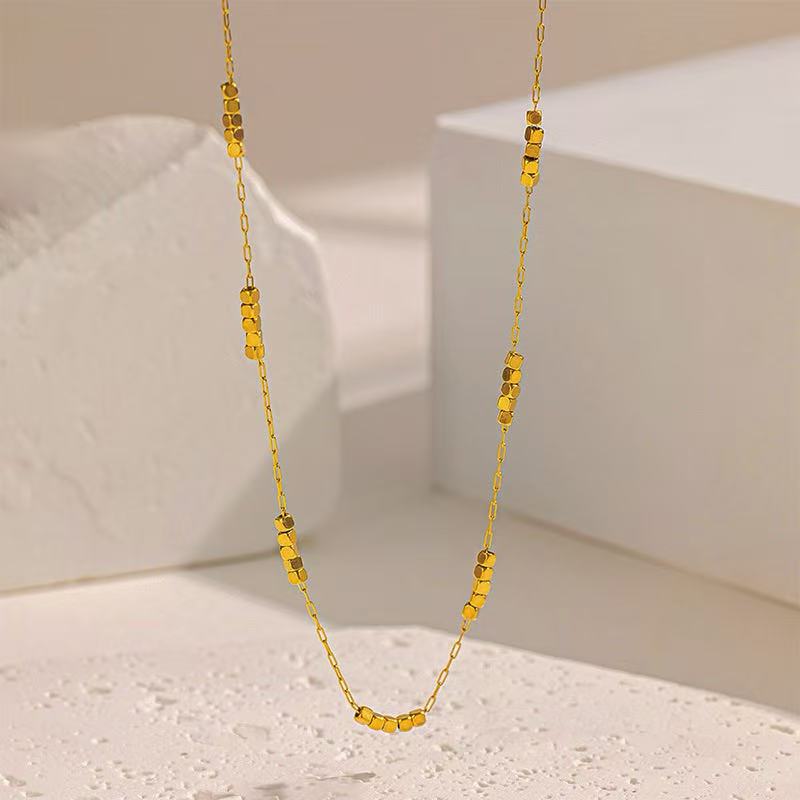 Un gioiello raffinato e moderno: collana con piccoli cubi geometrici disposti lungo una catena sottile. Disponibile in versione dorata o argentata, è perfetta per aggiungere un dettaglio essenziale e luminoso al tuo look quotidiano.