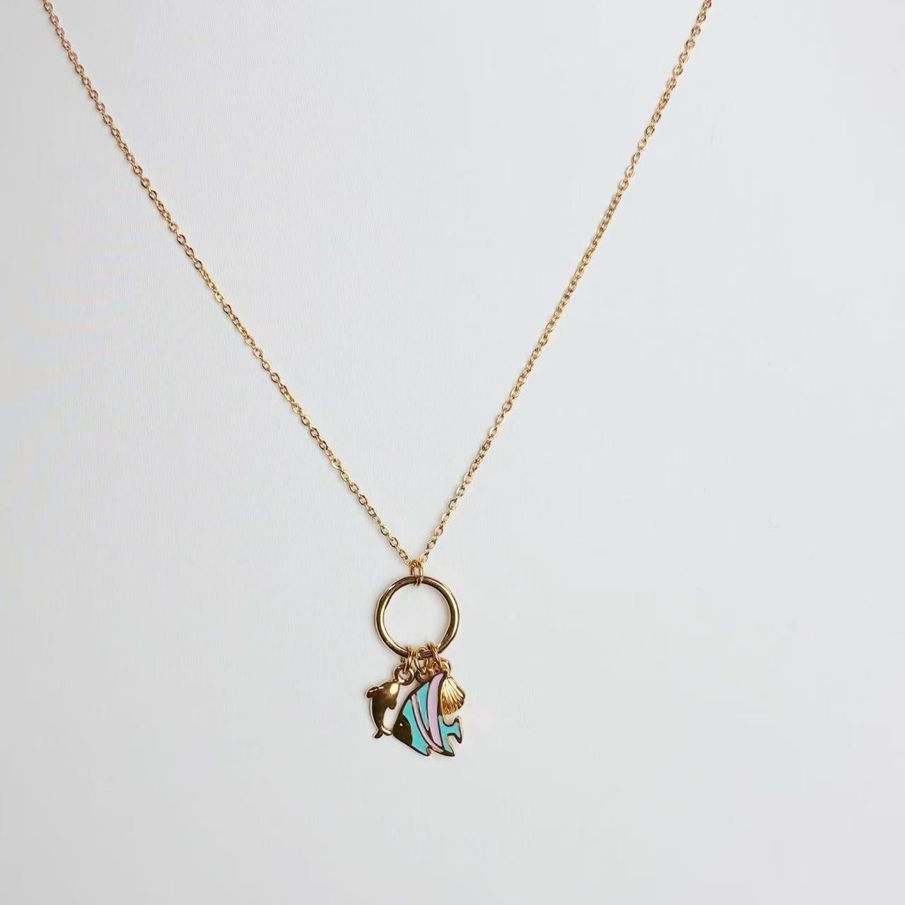 Un gioiello ispirato alla leggerezza delle onde e alla meraviglia dei fondali. Il ciondolo circolare raccoglie piccoli elementi marini — un pesce stilizzato e altre micro-forme decorative — creando un insieme dinamico e giocoso. Realizzata in acciaio inossidabile, questa collana porta con sé un’atmosfera vacanziera e spensierata, perfetta per chi ama dettagli simbolici e pieni di vita.