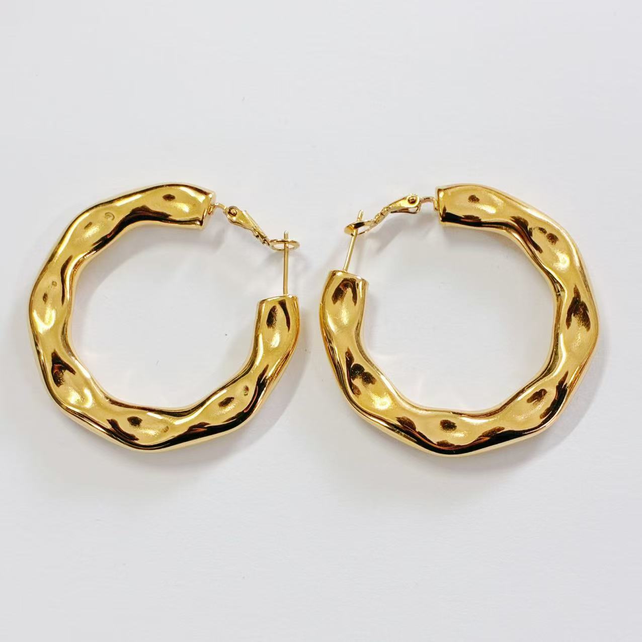 Questi orecchini a cerchio si distinguono per la loro superficie irregolare e organica, che cattura la luce in modo unico. La finitura oro lucido aggiunge un tocco caldo e sofisticato, perfetto per chi ama la semplicità con personalità.