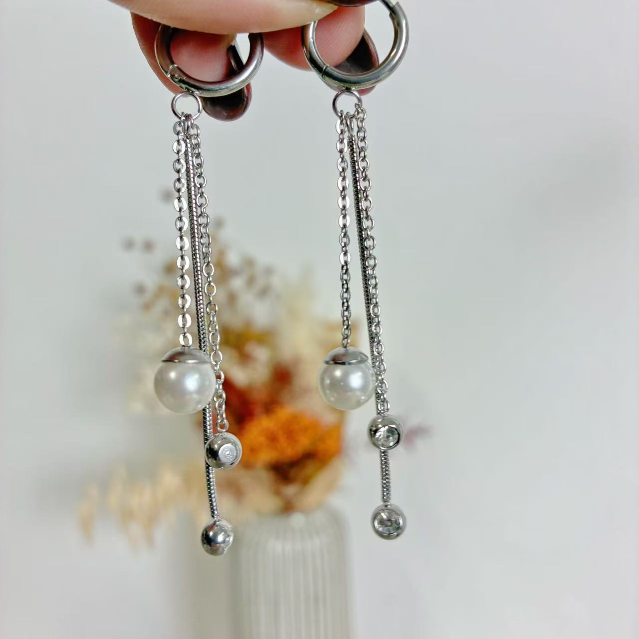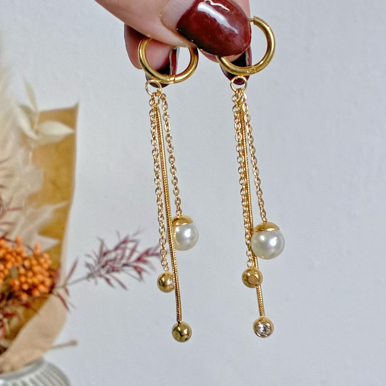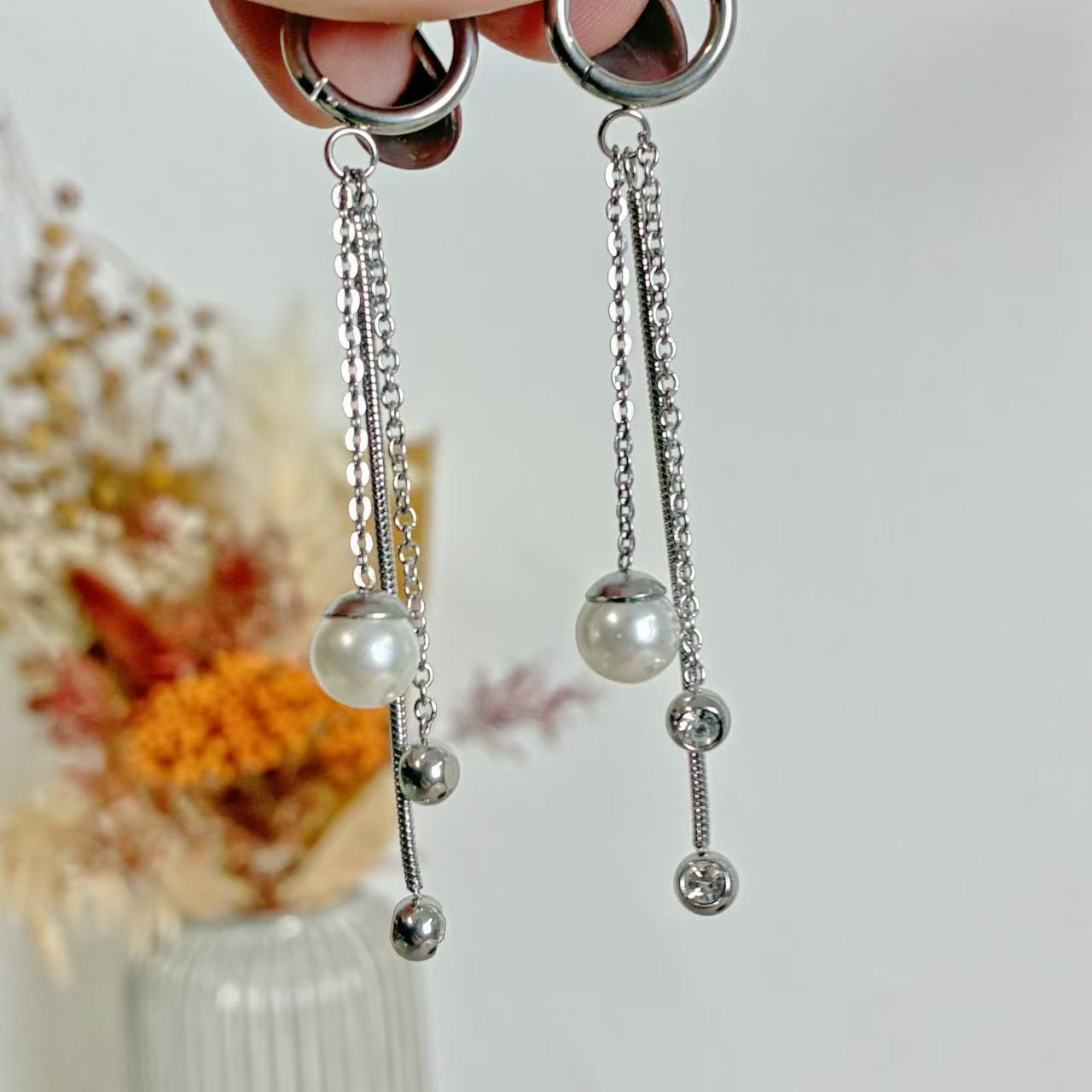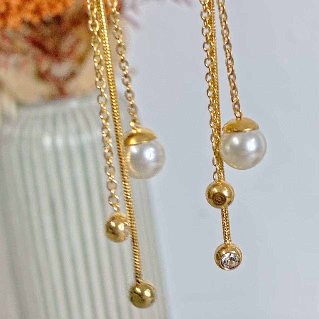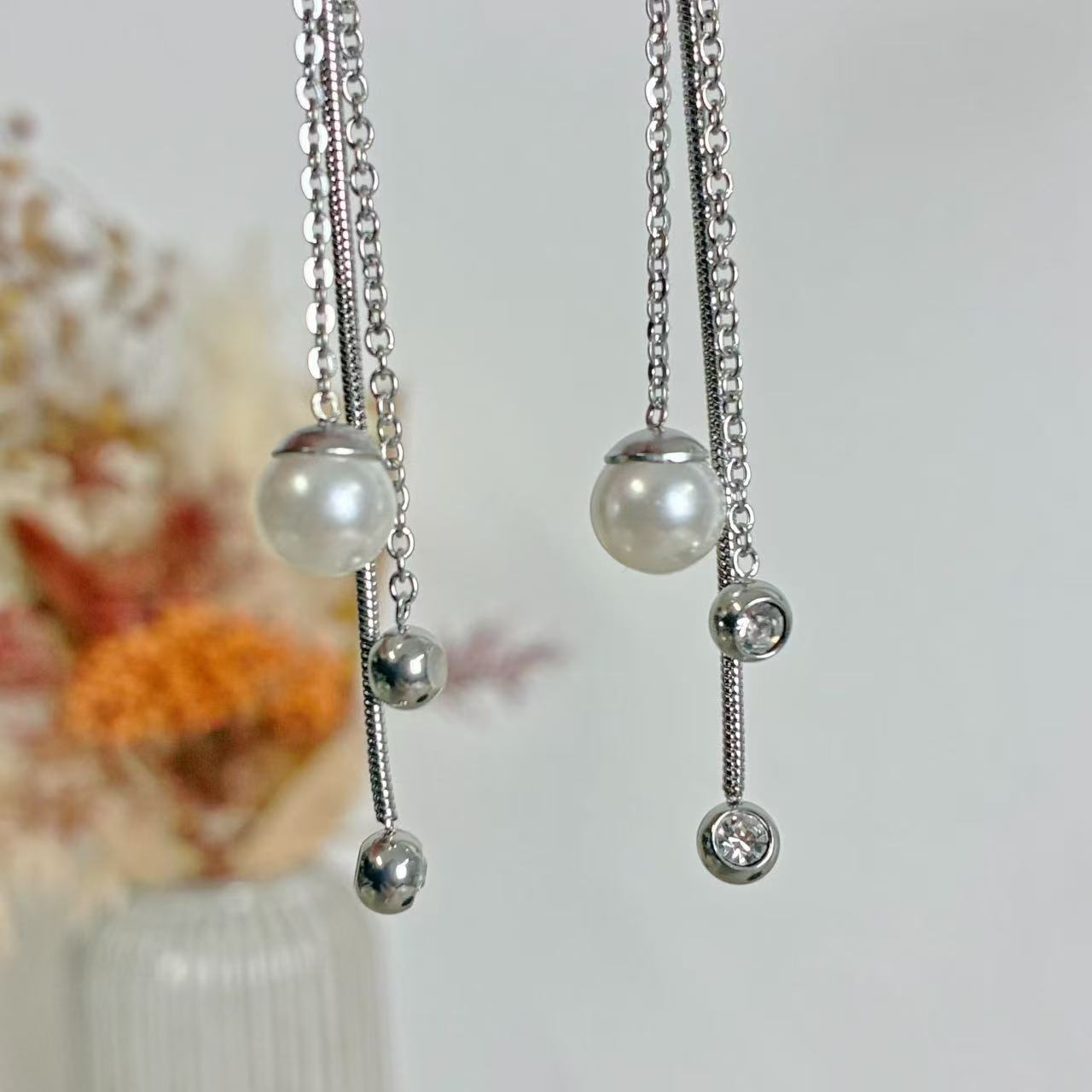 Gli “Orecchini Caduta di Perle” in acciaio inossidabile 316L presentano catene sottili con pendenti sferici che creano un movimento fluido e raffinato ad ogni gesto.