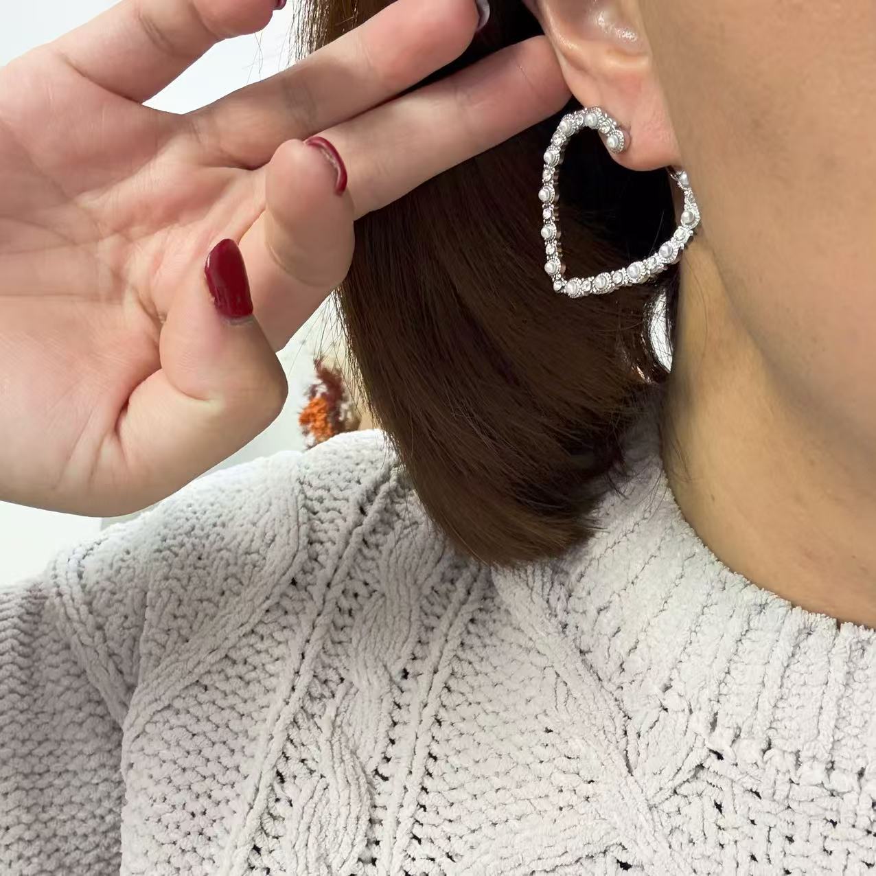 Un paio di orecchini che trasformano il romanticismo in una forma moderna: una silhouette a cuore, scolpita in linee morbide, impreziosita da piccole perle e luminosi dettagli che catturano la luce ad ogni movimento.