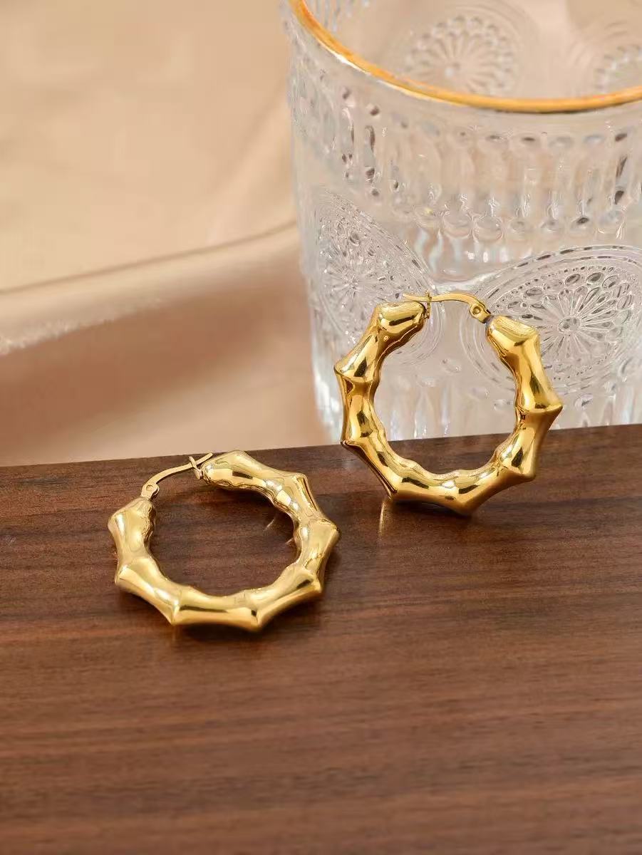 Un paio di orecchini in acciaio inossidabile ispirati alla forma organica del bamboo, caratterizzati da un profilo irregolare e scolpito che dona movimento e personalità. La finitura lucida esalta le superfici morbide e arrotondate, creando un accessorio moderno e al tempo stesso dal richiamo naturale. Perfetti per aggiungere un tocco unico e deciso a qualsiasi look.