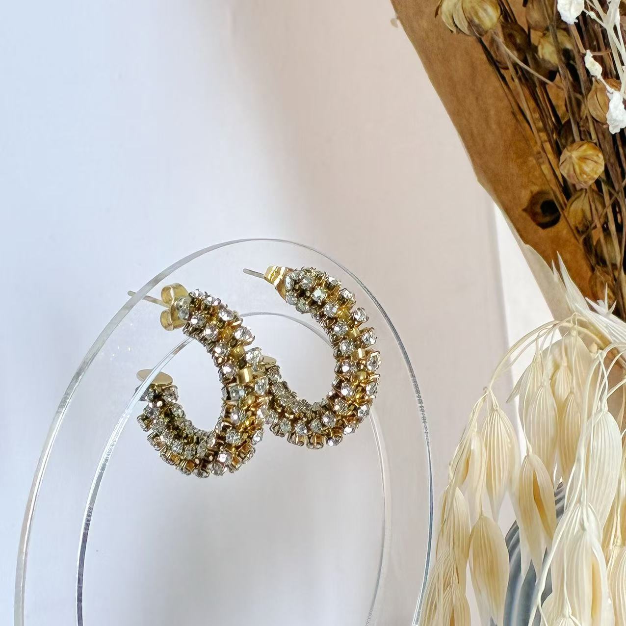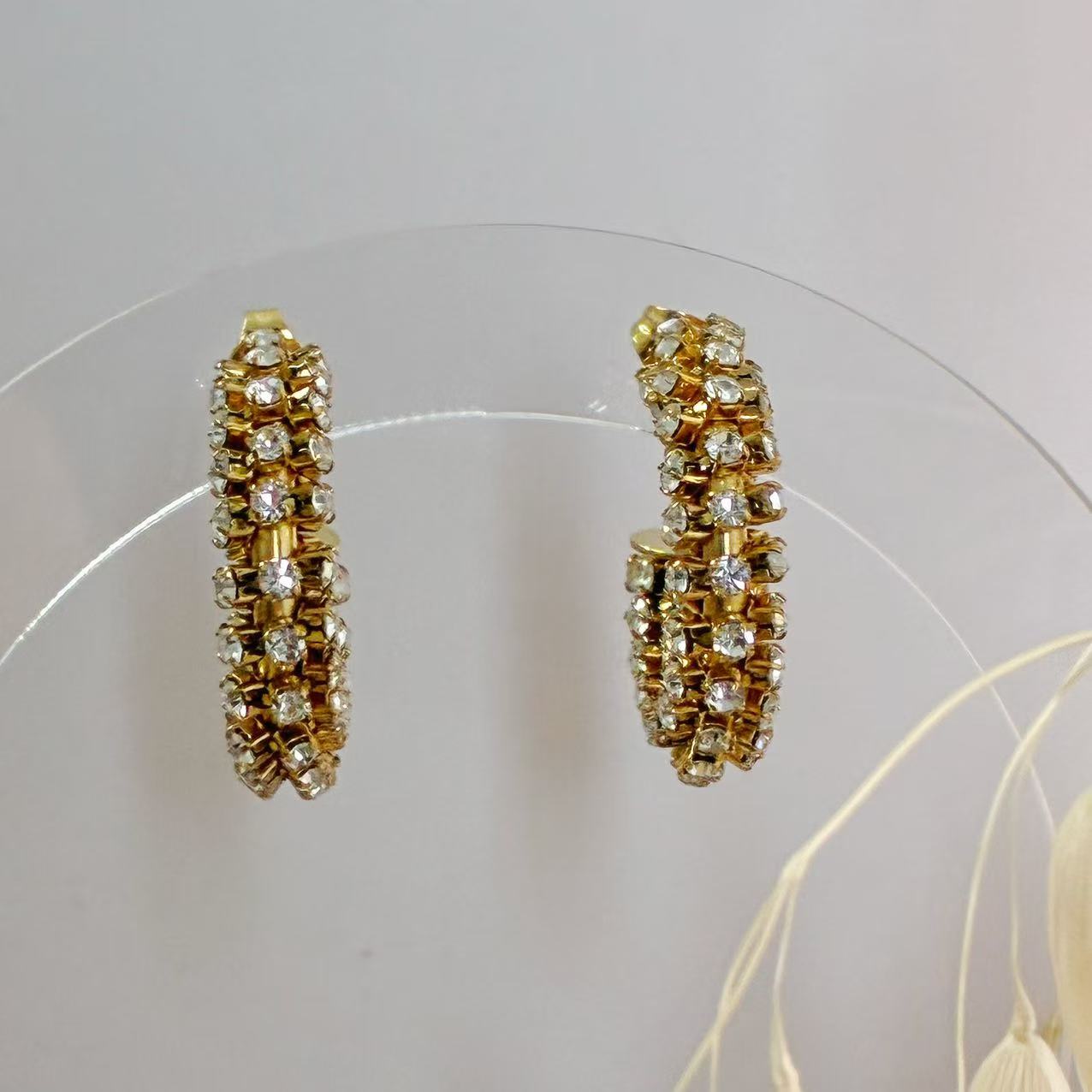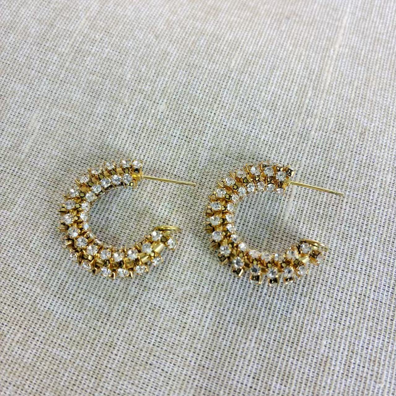 Gli “Orecchini Cerchio di Brillio” in acciaio inossidabile 316L presentano una struttura semicircolare decorata da cristalli incastonati, che catturano la luce ad ogni movimento.