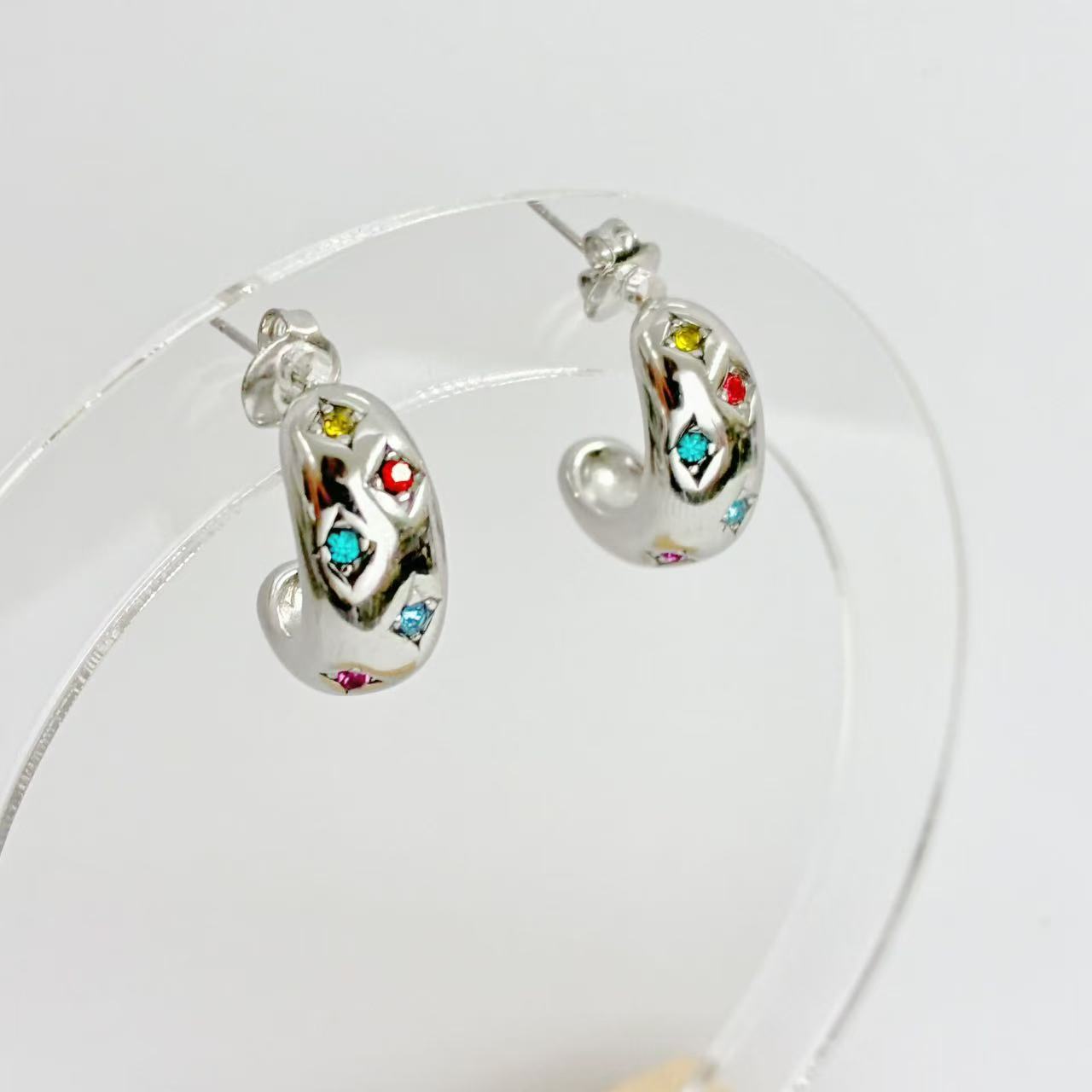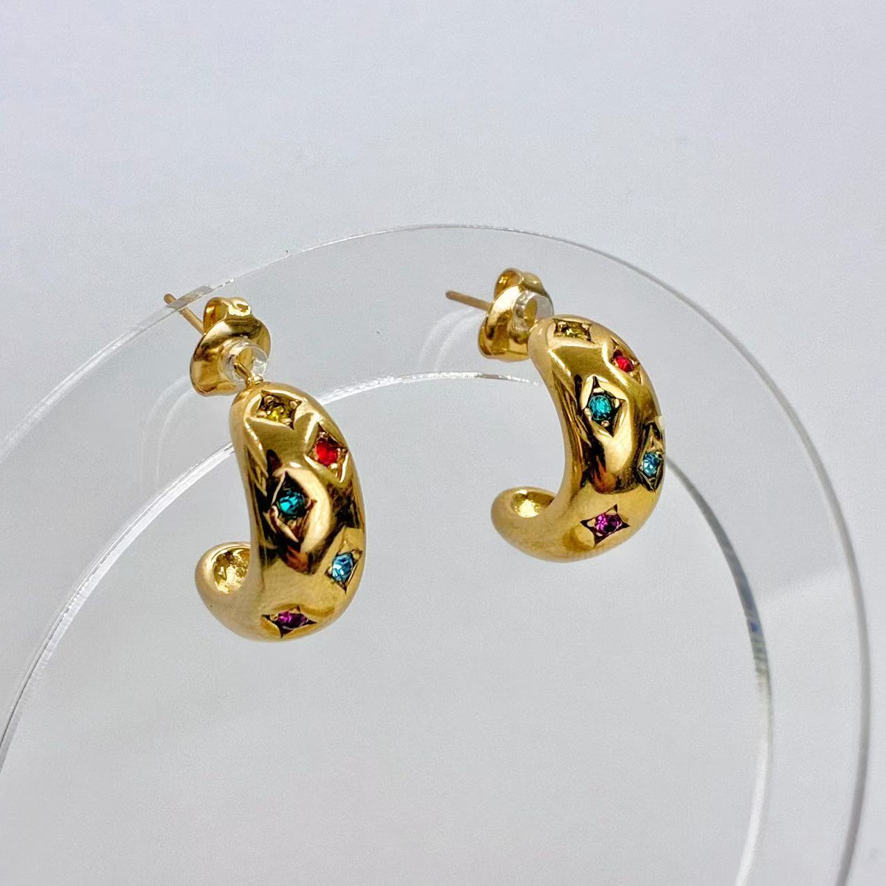 Le pietre multicolori creano un contrasto raffinato con il metallo dorato, donando agli orecchini una luminosità giocosa ma elegante.