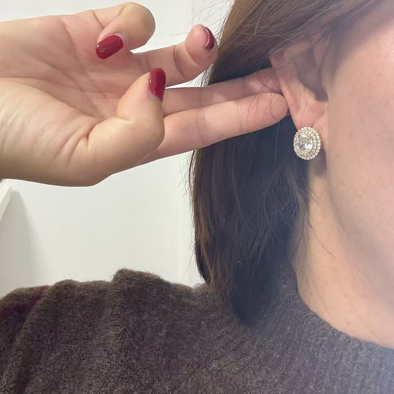 Questi orecchini sono un vero gioiello scenografico: un grande cristallo centrale taglio ovale incastonato in una doppia corona di micro-cristalli luminosi, il tutto completato da una delicata decorazione dorata a forma di fiocco/corona che aggiunge un tocco regale e romantico.