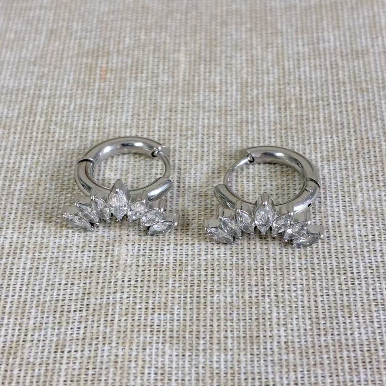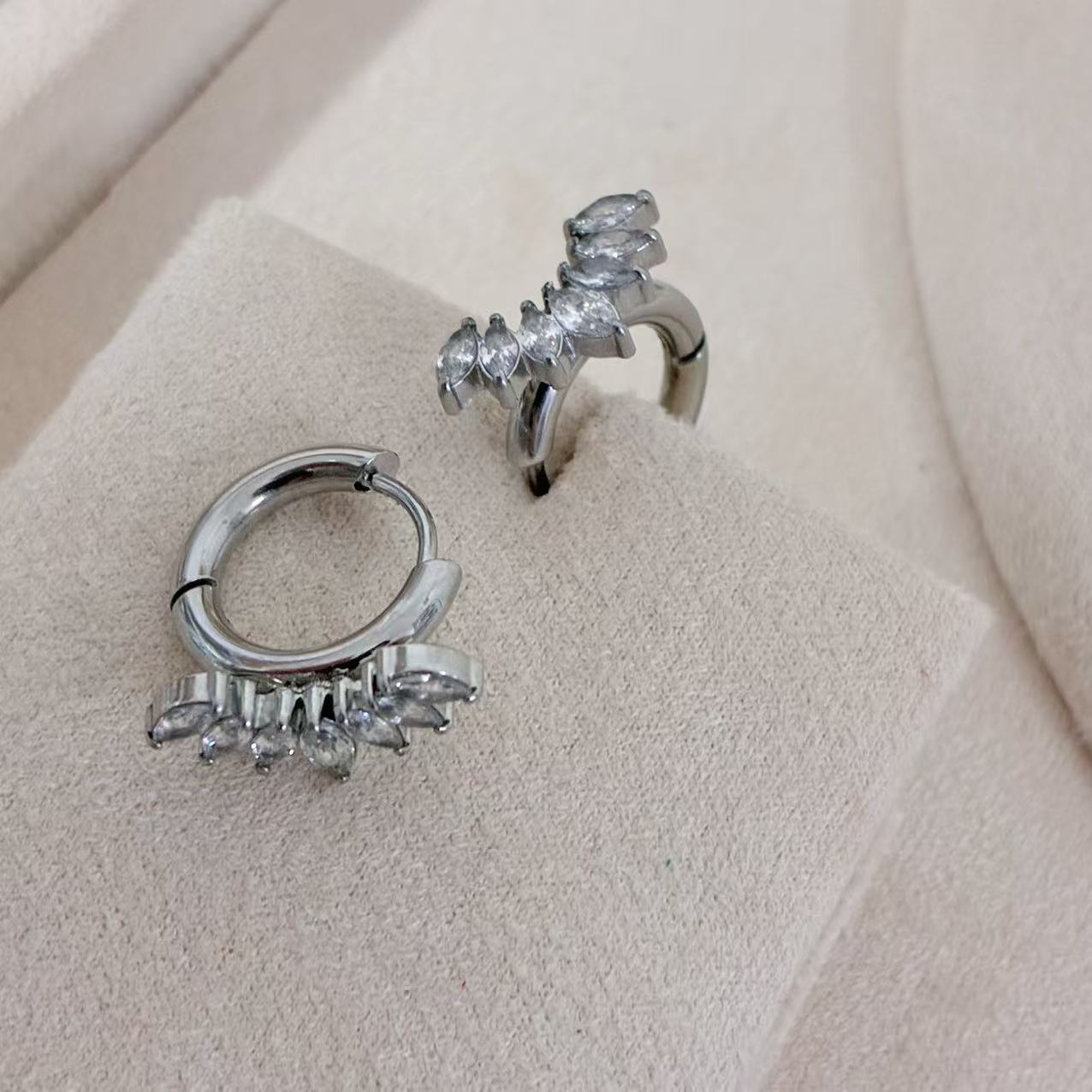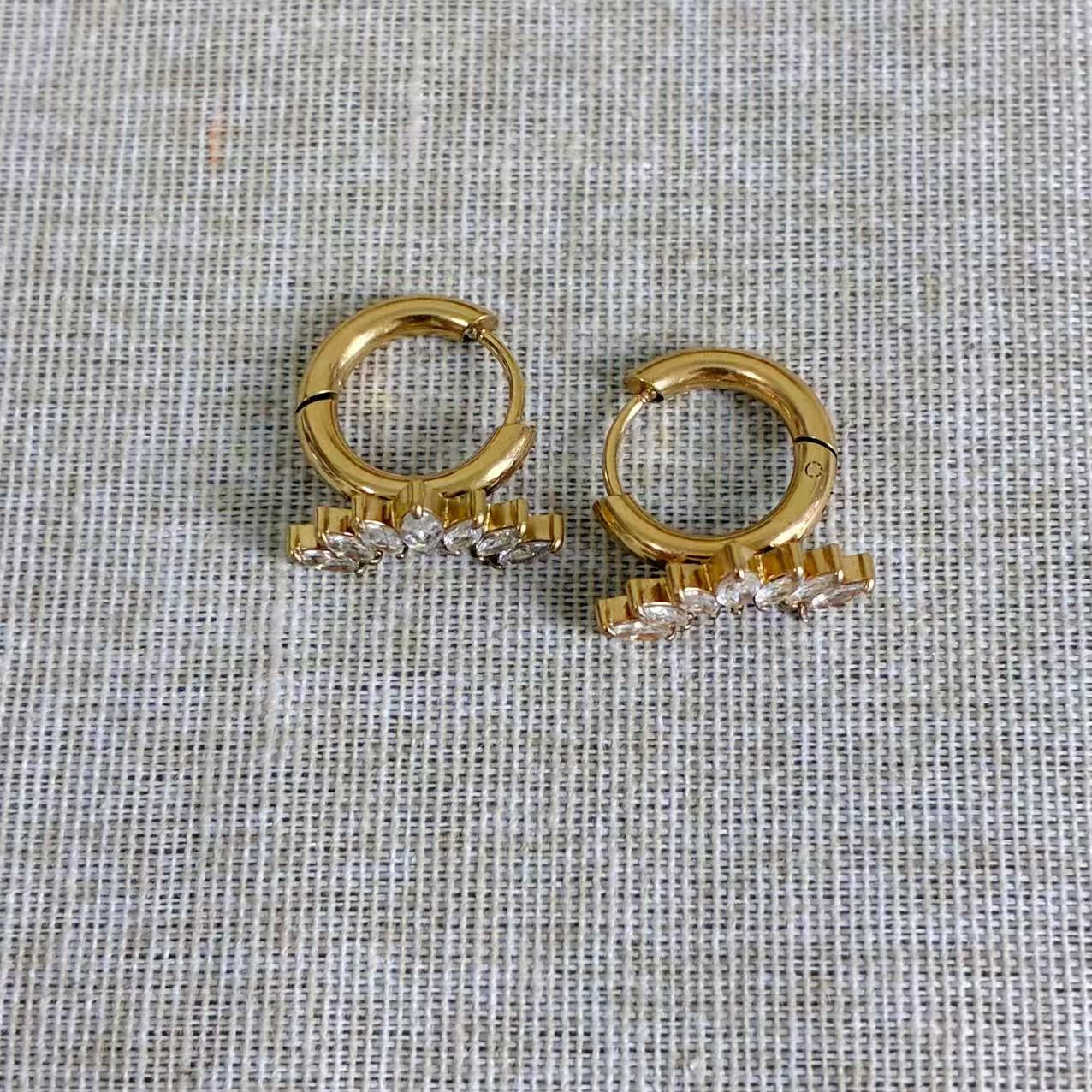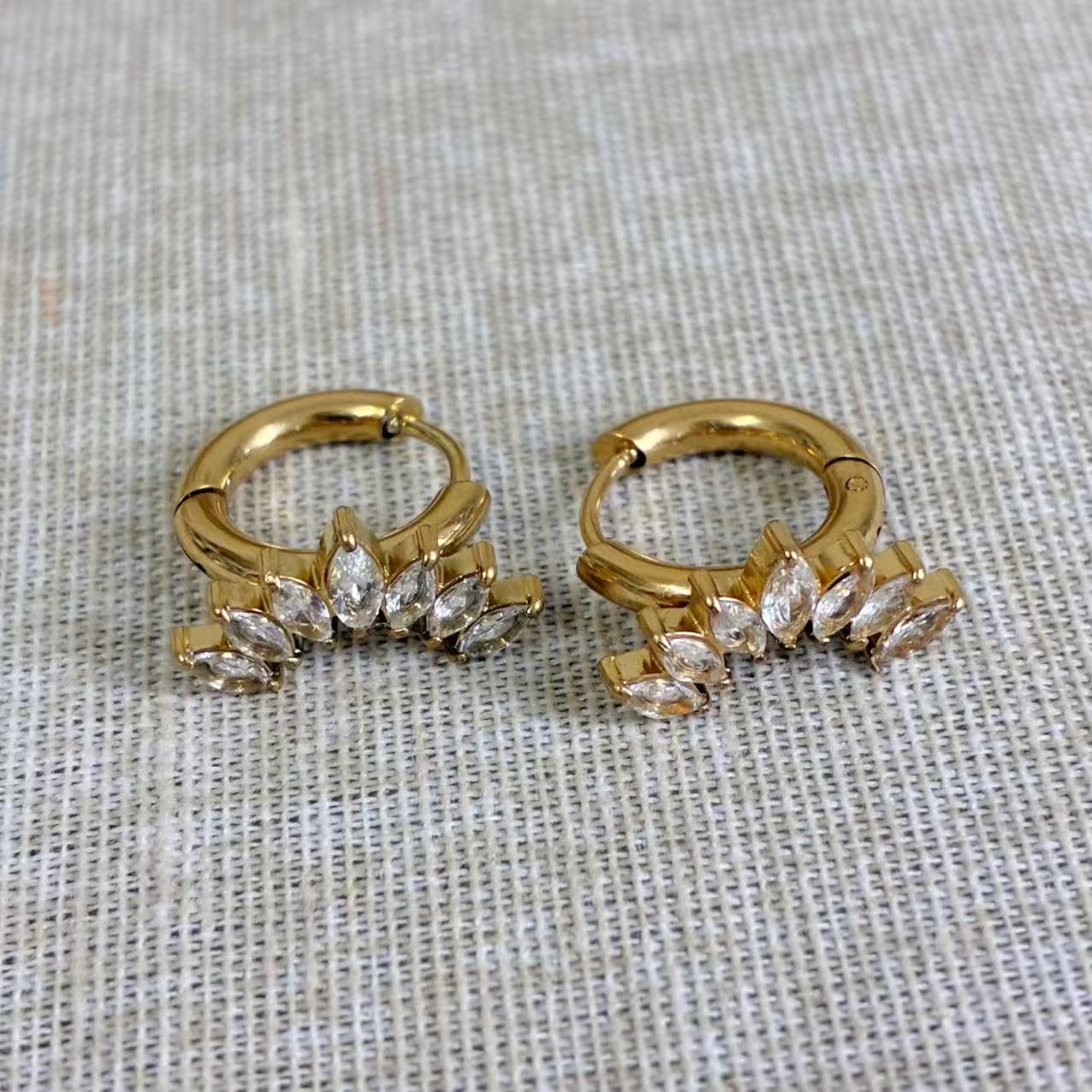 Questi orecchini a cerchio in acciaio inossidabile placcato oro sono impreziositi da zirconi taglio marquise, disposti come una piccola corona che illumina il viso con eleganza.