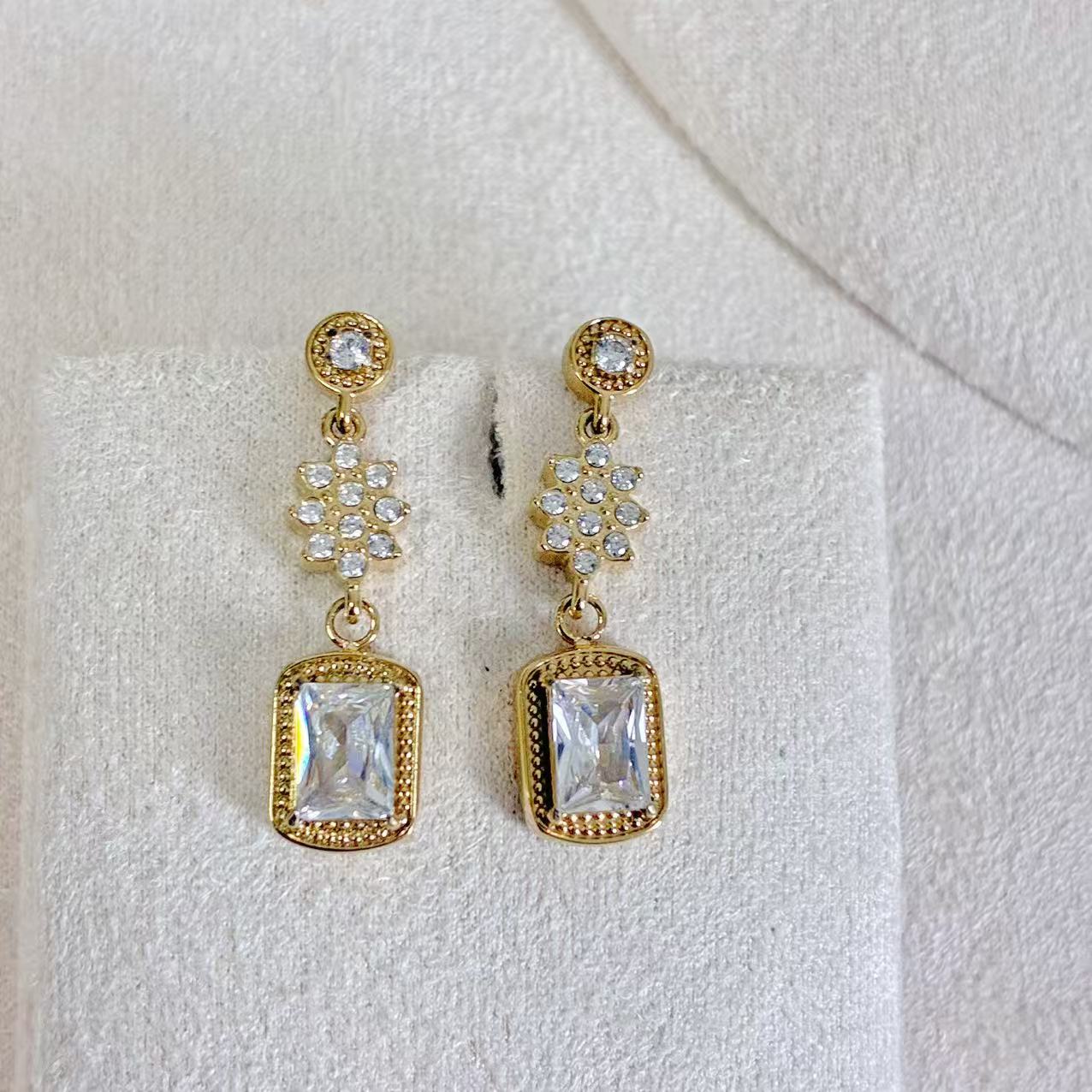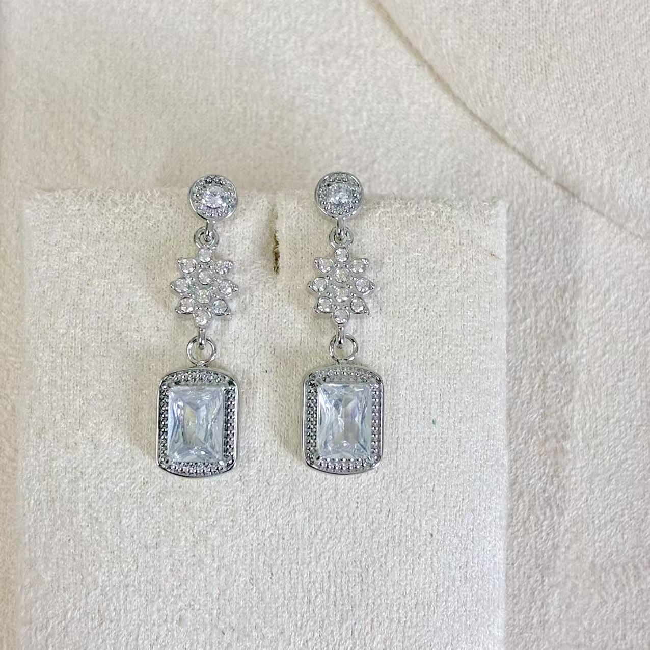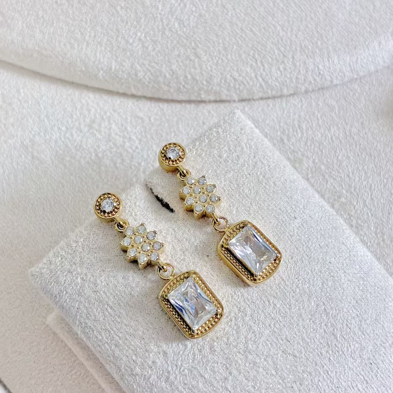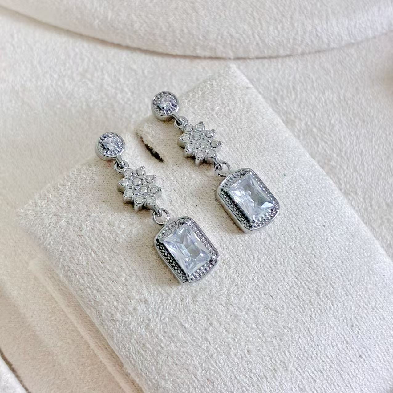 Questi orecchini pendenti in acciaio inossidabile uniscono la raffinatezza dei cristalli taglio rettangolare con la grazia di un piccolo motivo floreale, creando un equilibrio perfetto tra femminilità e splendore.