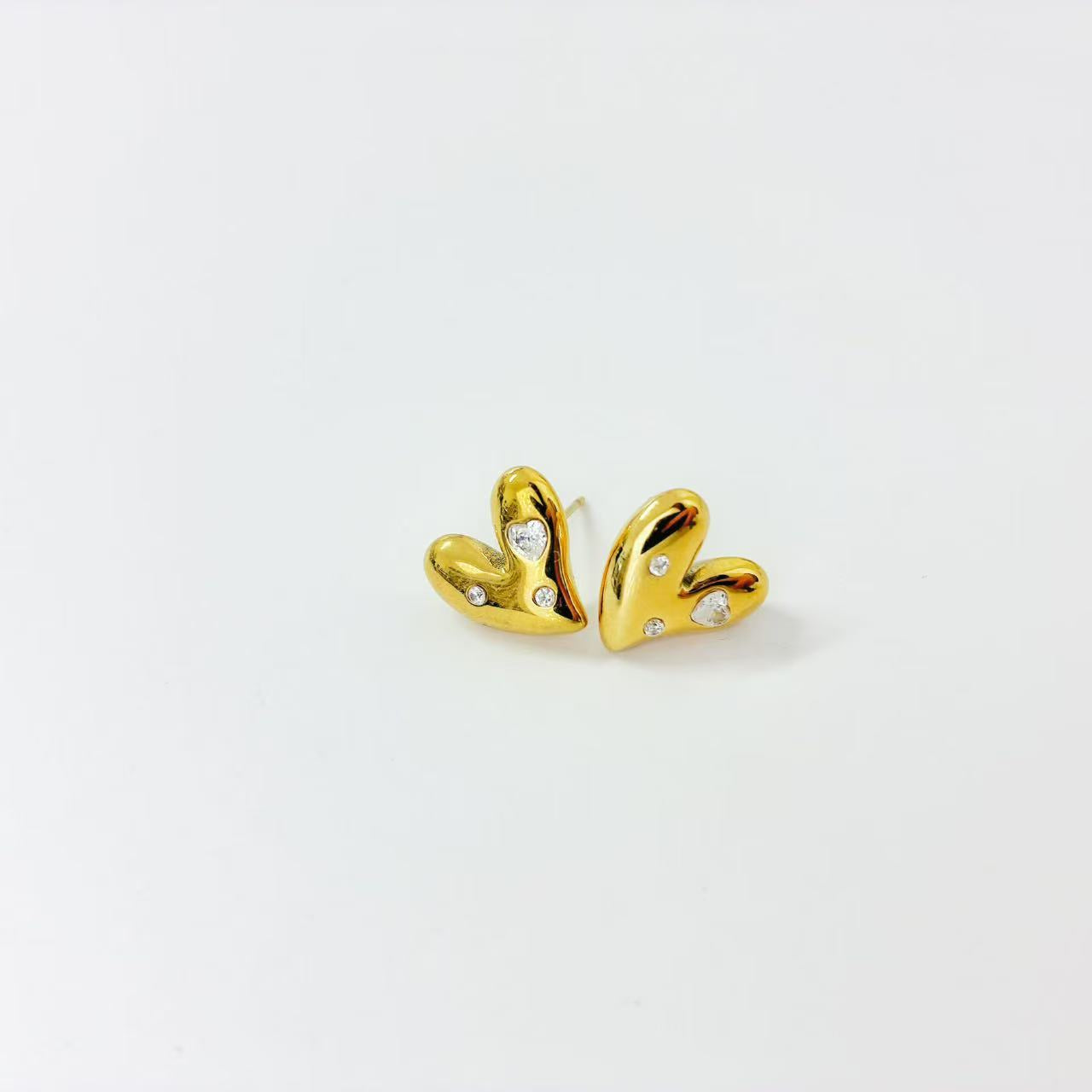 Un paio di orecchini romantici e moderni, caratterizzati da un cuore dalla forma morbida e irregolare che dona un effetto fluido e contemporaneo. I piccoli punti luce incastonati sulla superficie aggiungono brillantezza e rendono il design ancora più dolce e ricercato.