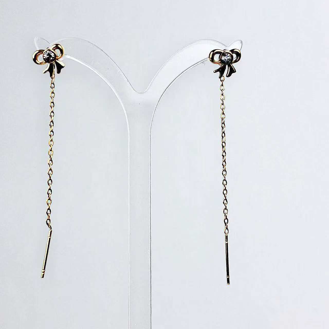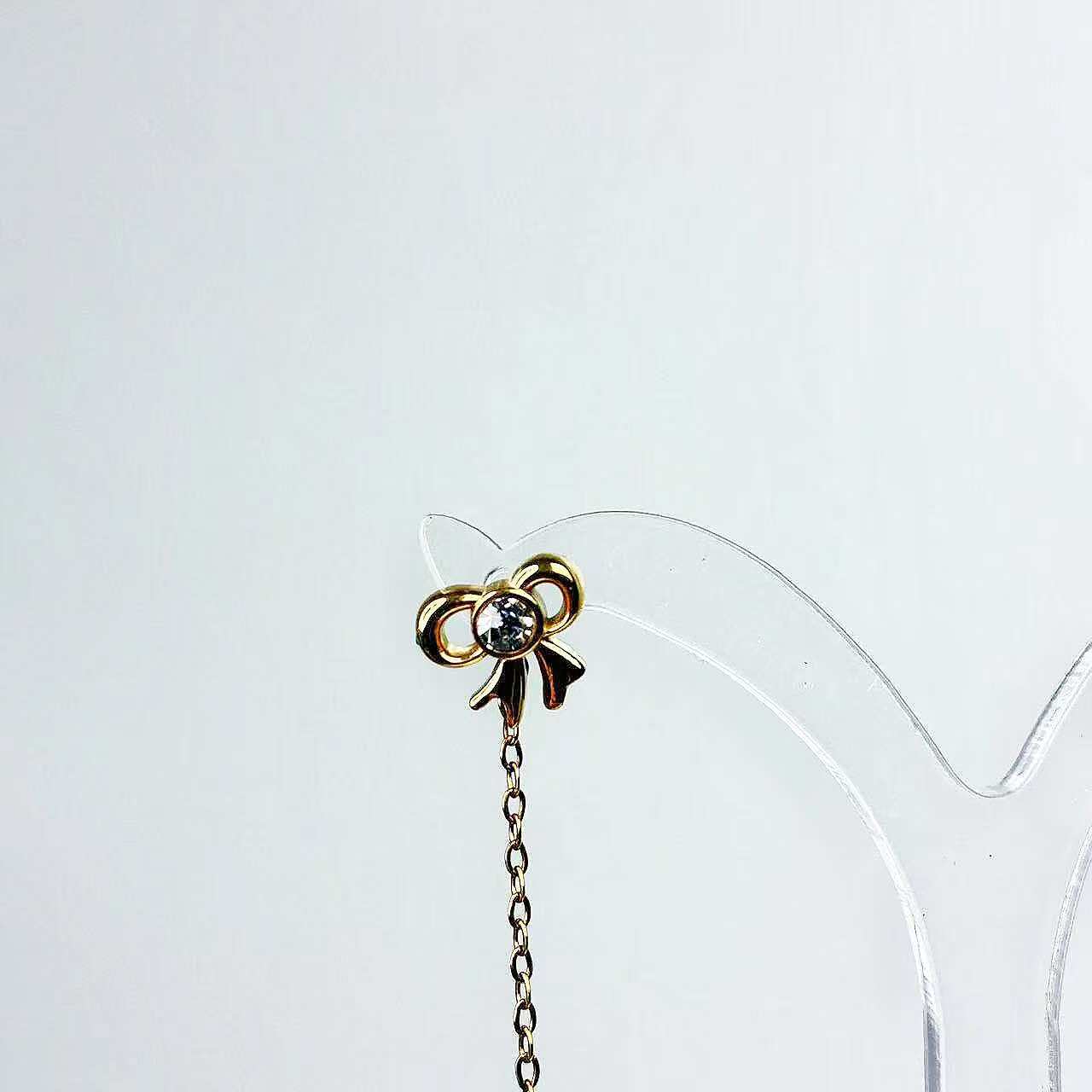 Un paio di orecchini dalla grazia discreta, caratterizzati da un piccolo motivo a fiocco che introduce una linea pendente essenziale e slanciata. Il dettaglio superiore, curato e femminile, dialoga con la catena sottile creando un equilibrio raffinato tra dolcezza e modernità.