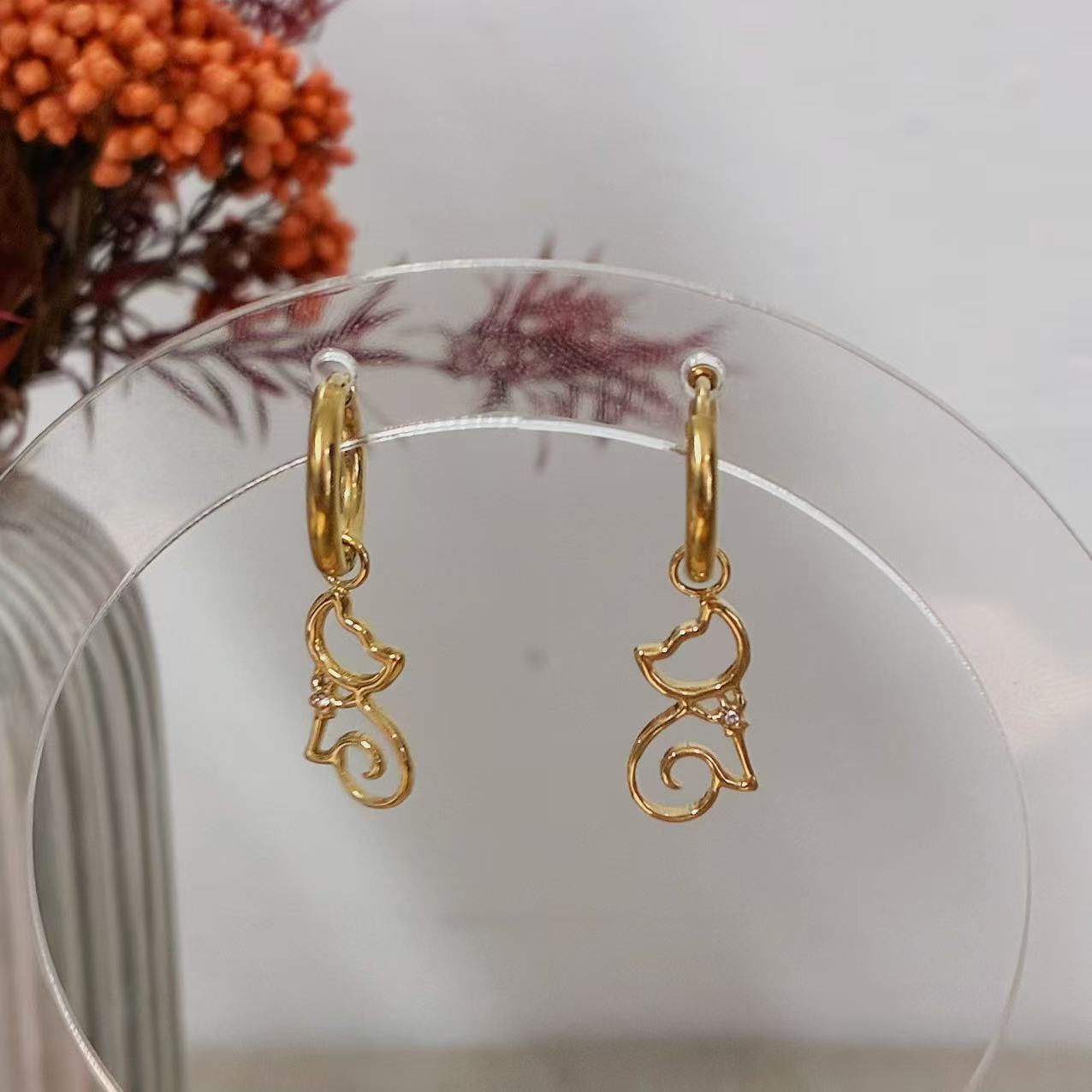Questi orecchini a cerchietto presentano un delicato pendente a forma di gatto, con linee sinuose e un piccolo zircone che dona un tocco di luce raffinata. Un design tenero e chic, perfetto per chi adora i gatti e gli accessori con personalità!