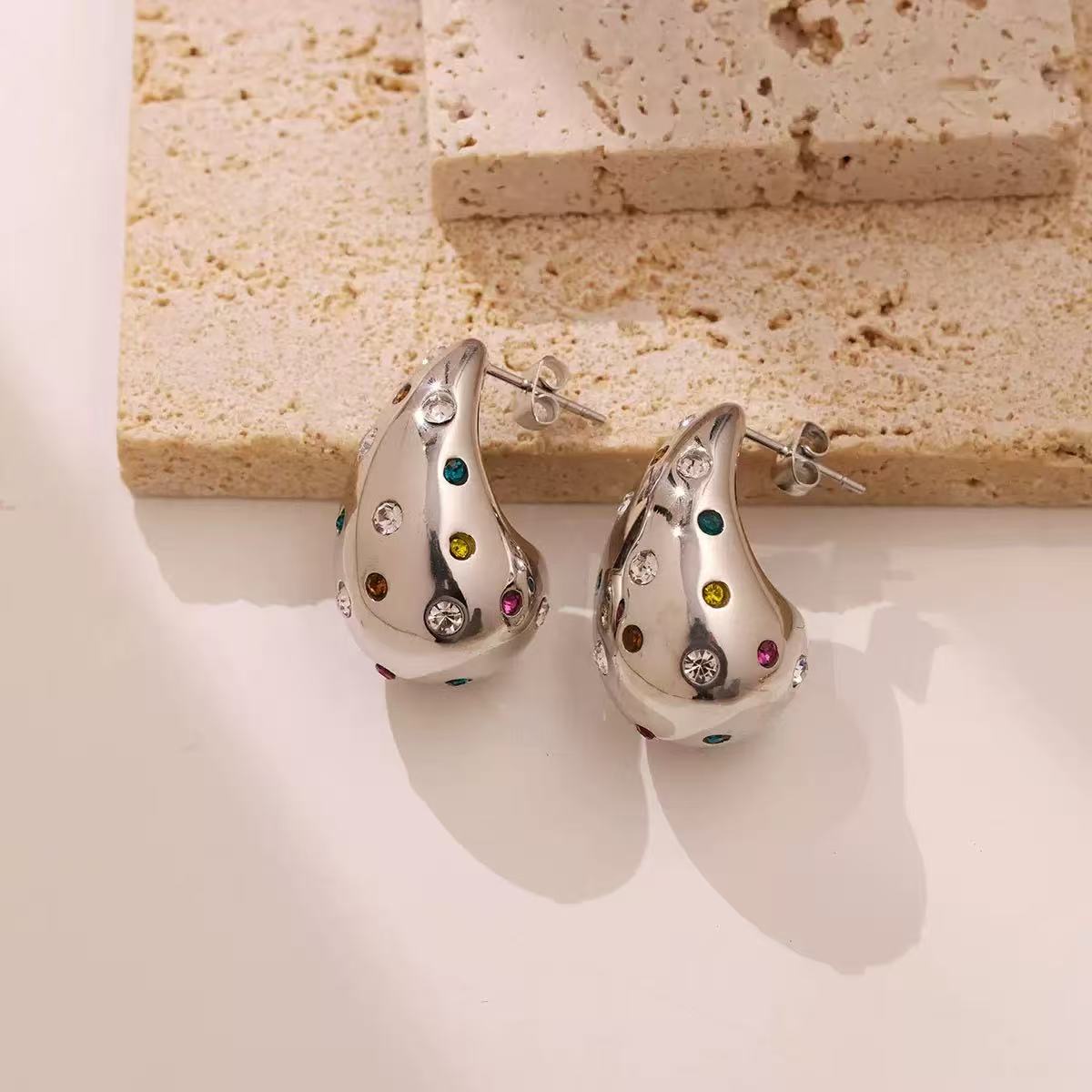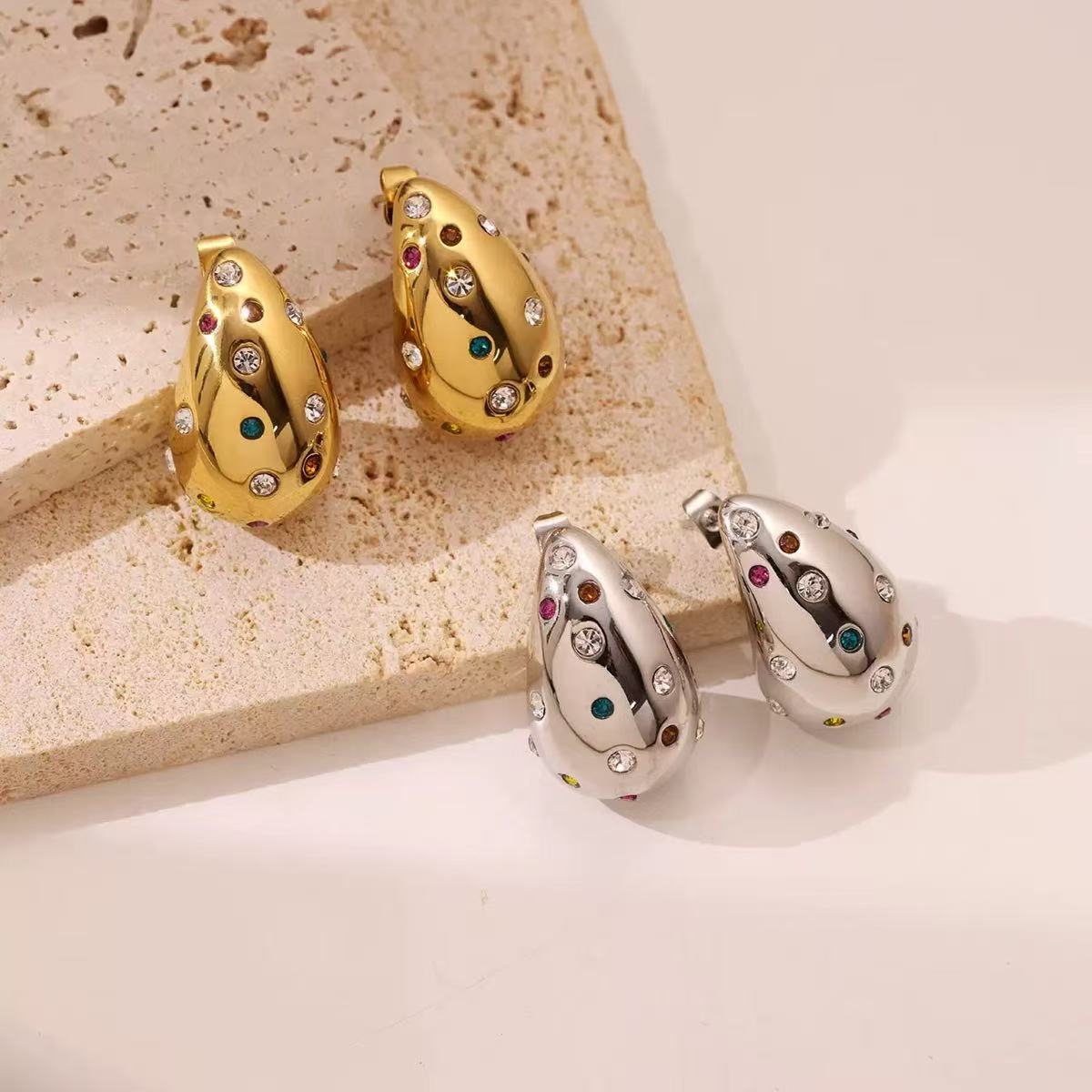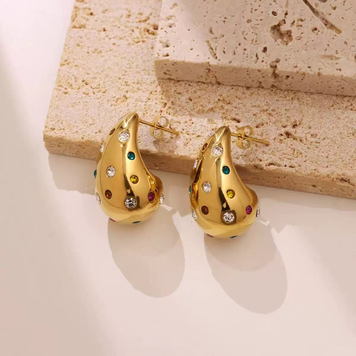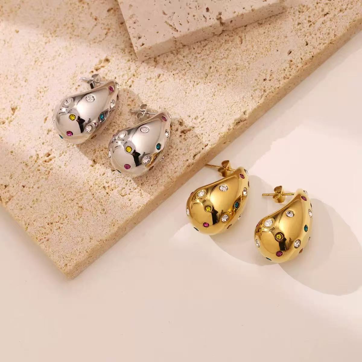 Un'esplosione di gioia e raffinatezza in un unico design. Gli orecchini Goccia Arcobaleno si distinguono per la loro forma bombata e sinuosa, realizzata in pregiato acciaio inossidabile con finitura dorata a specchio. La superficie è impreziosita da una costellazione di zirconi multicolore incastonati, che catturano i riflessi del sole regalando una lucentezza vibrante e vivace.