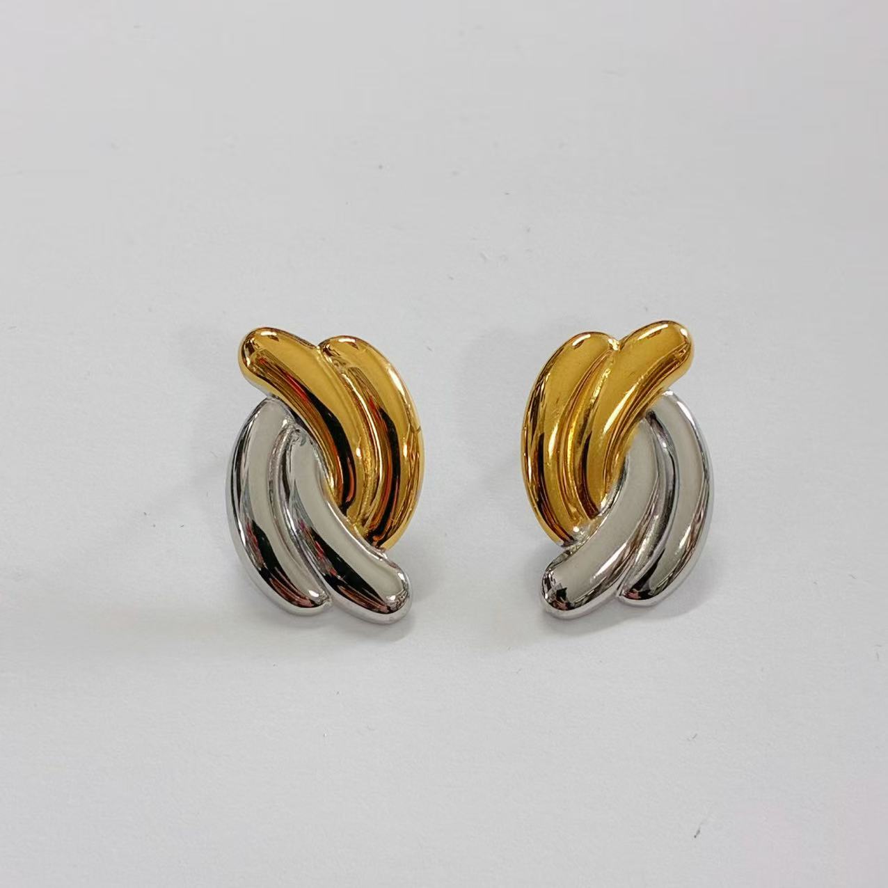 Questi orecchini combinano fasce dorate e argentate intrecciate in una forma elegante e dinamica. La superficie lucidissima riflette la luce con raffinatezza, creando un accessorio perfetto per aggiungere glamour ad ogni look.