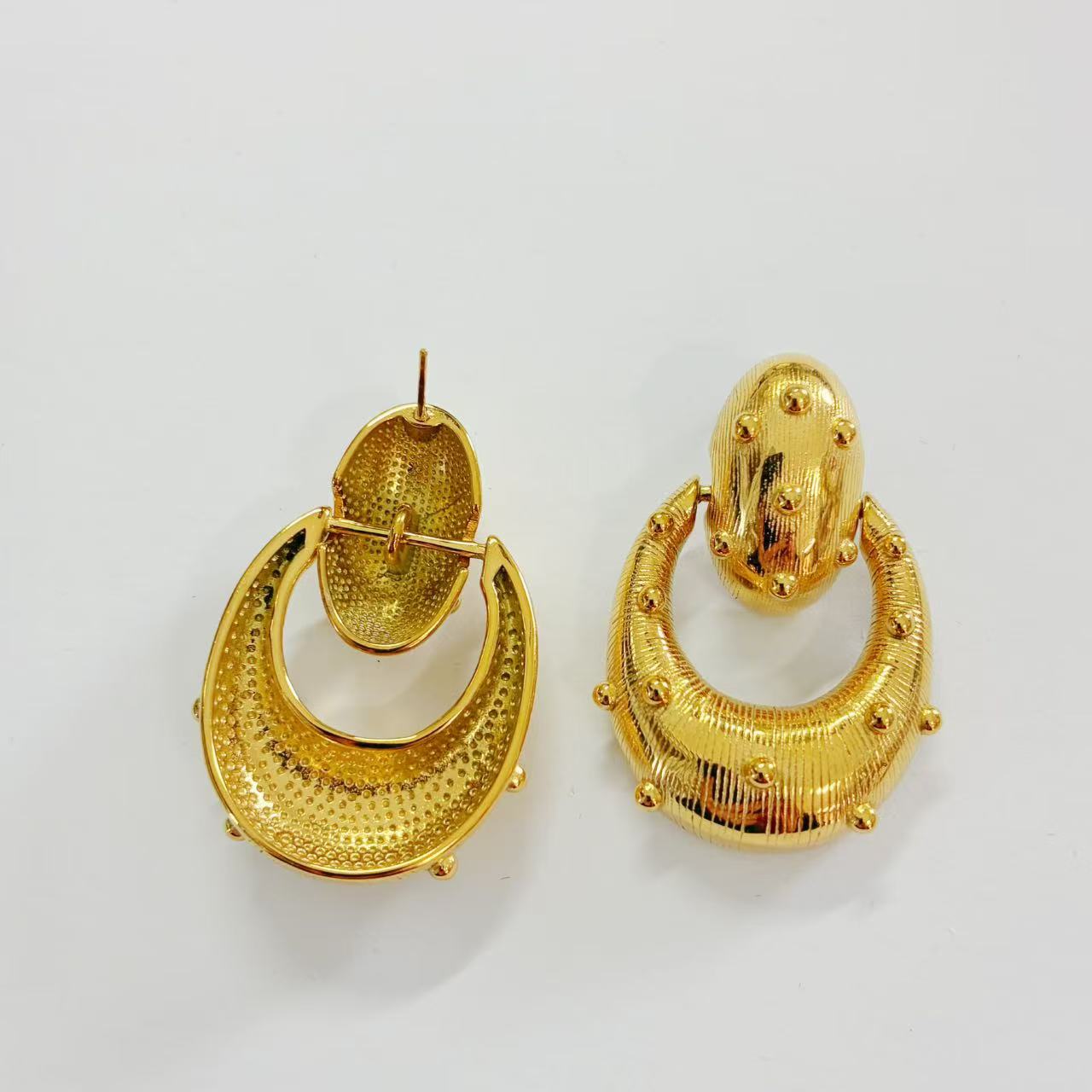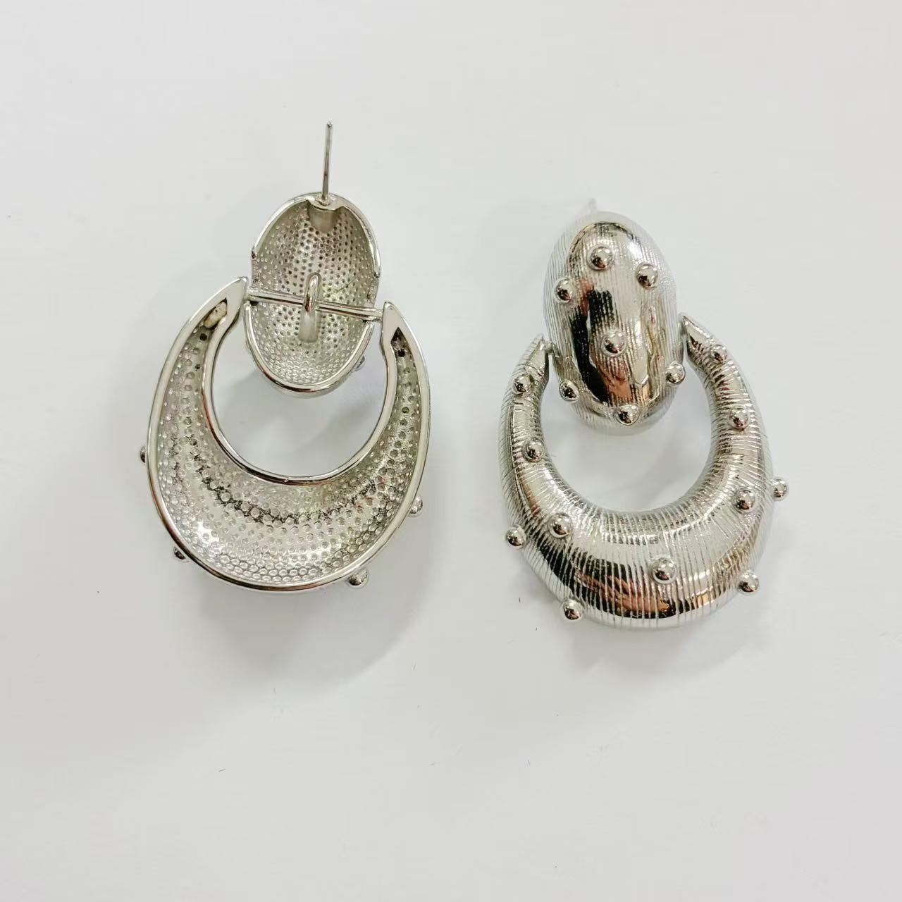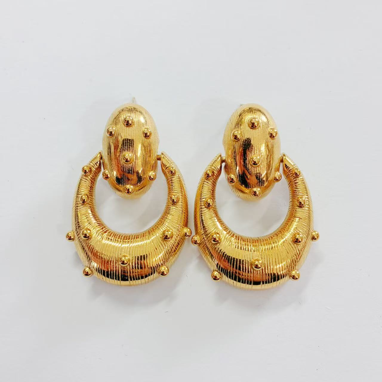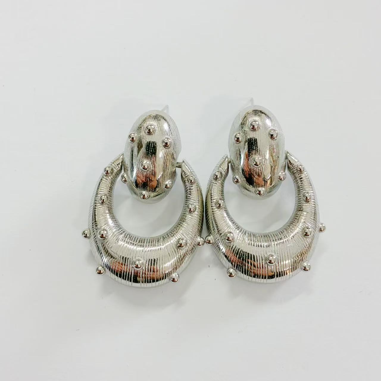 Questi orecchini oversize combinano una texture incisa con piccoli rilievi sferici, creando un effetto moderno e molto caratteristico. Perfetti per chi ama accessori dal forte impatto visivo.