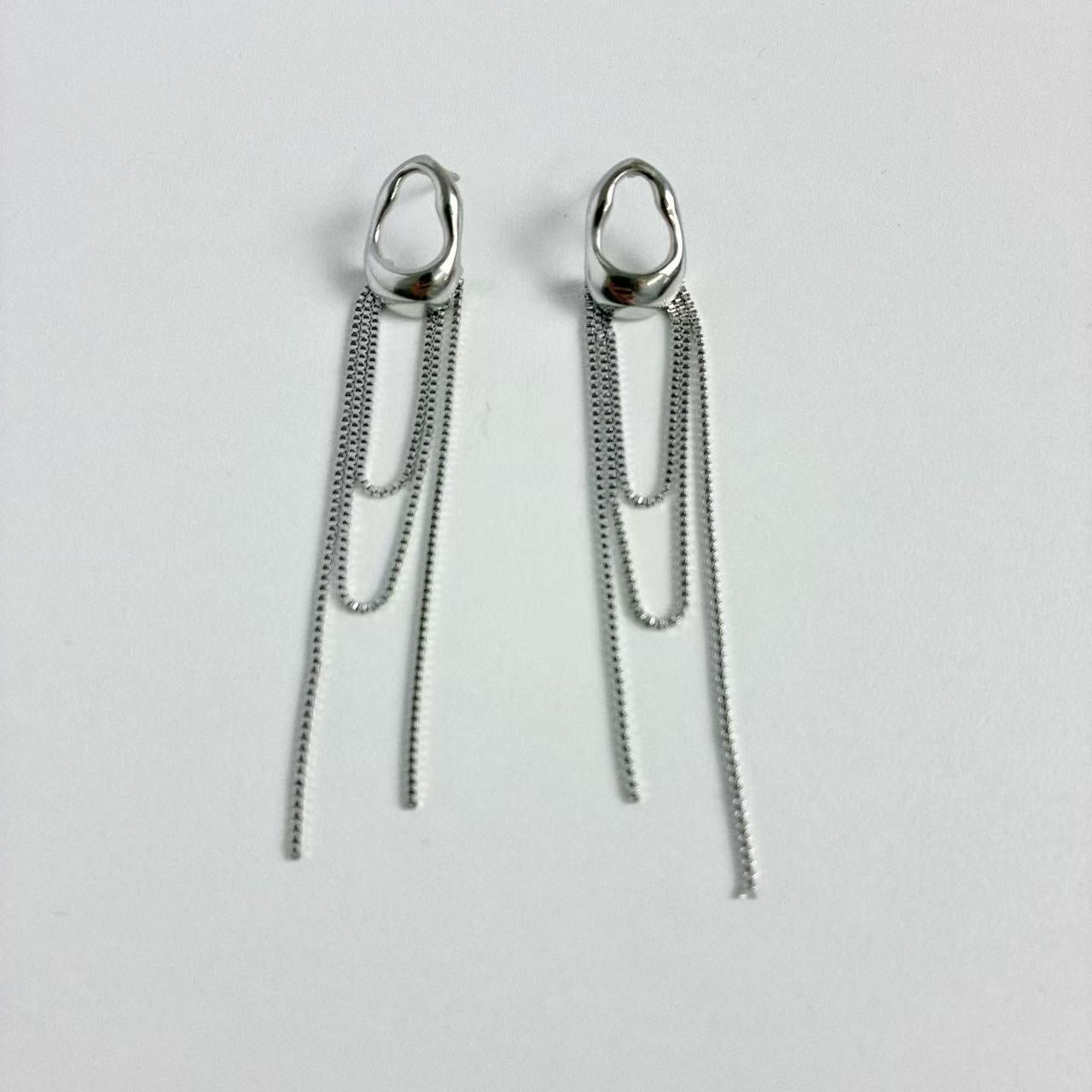 Design moderno ed elegante che unisce minimalismo e movimento. Realizzati in acciaio inossidabile, questi orecchini presentano una base dal profilo organico e irregolare, da cui scendono catene sottili e leggere che creano un effetto fluido e sofisticato. Disponibili in due varianti, argento e dorato, sono perfetti per chi ama uno stile contemporaneo e ricercato.