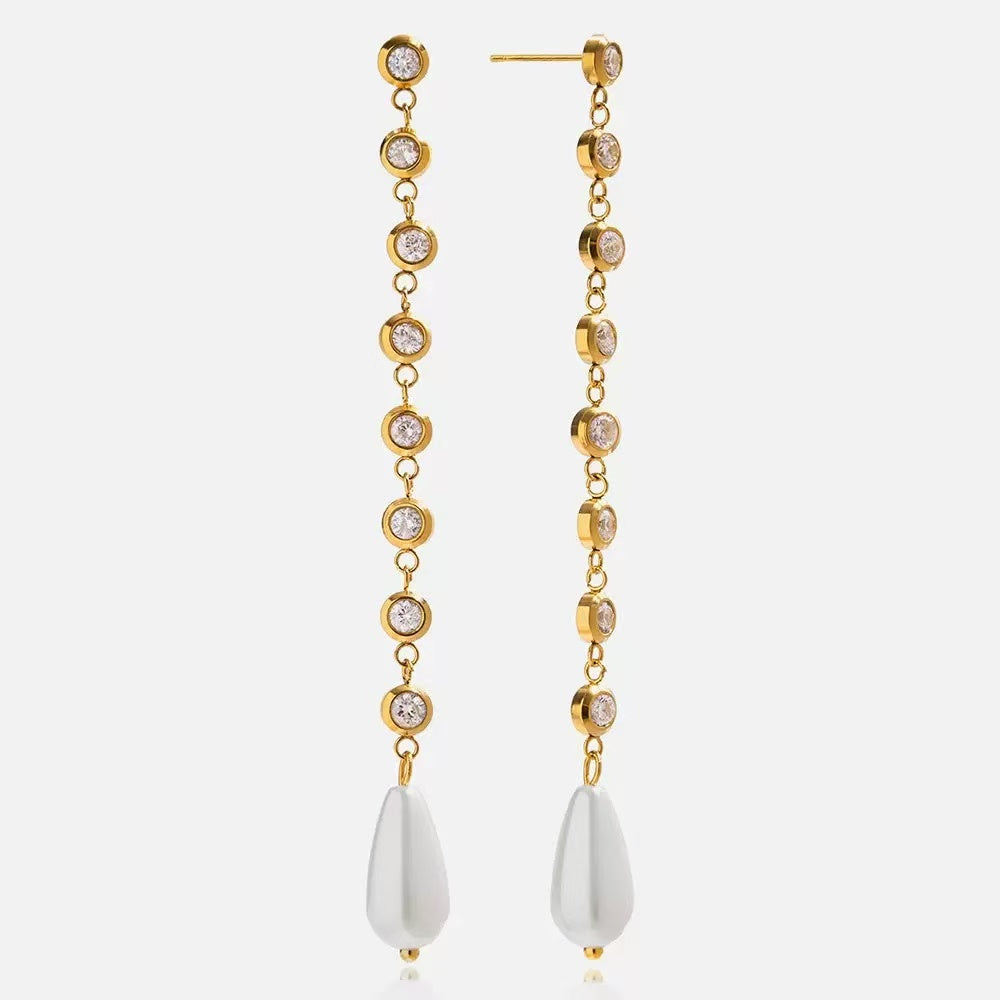 Un paio di orecchini in acciaio inossidabile dal design lungo e sofisticato, caratterizzati da una sequenza armoniosa di cristalli incastonati che catturano la luce ad ogni movimento. La composizione termina con una delicata goccia perlacea dall’aspetto morbido e ricercato, creando un equilibrio perfetto tra brillantezza e morbidezza.