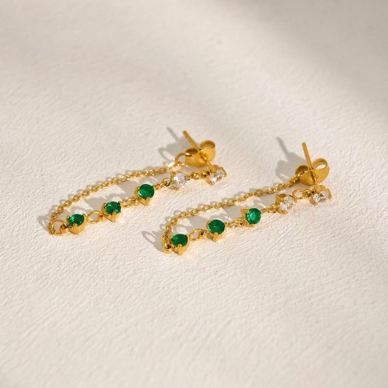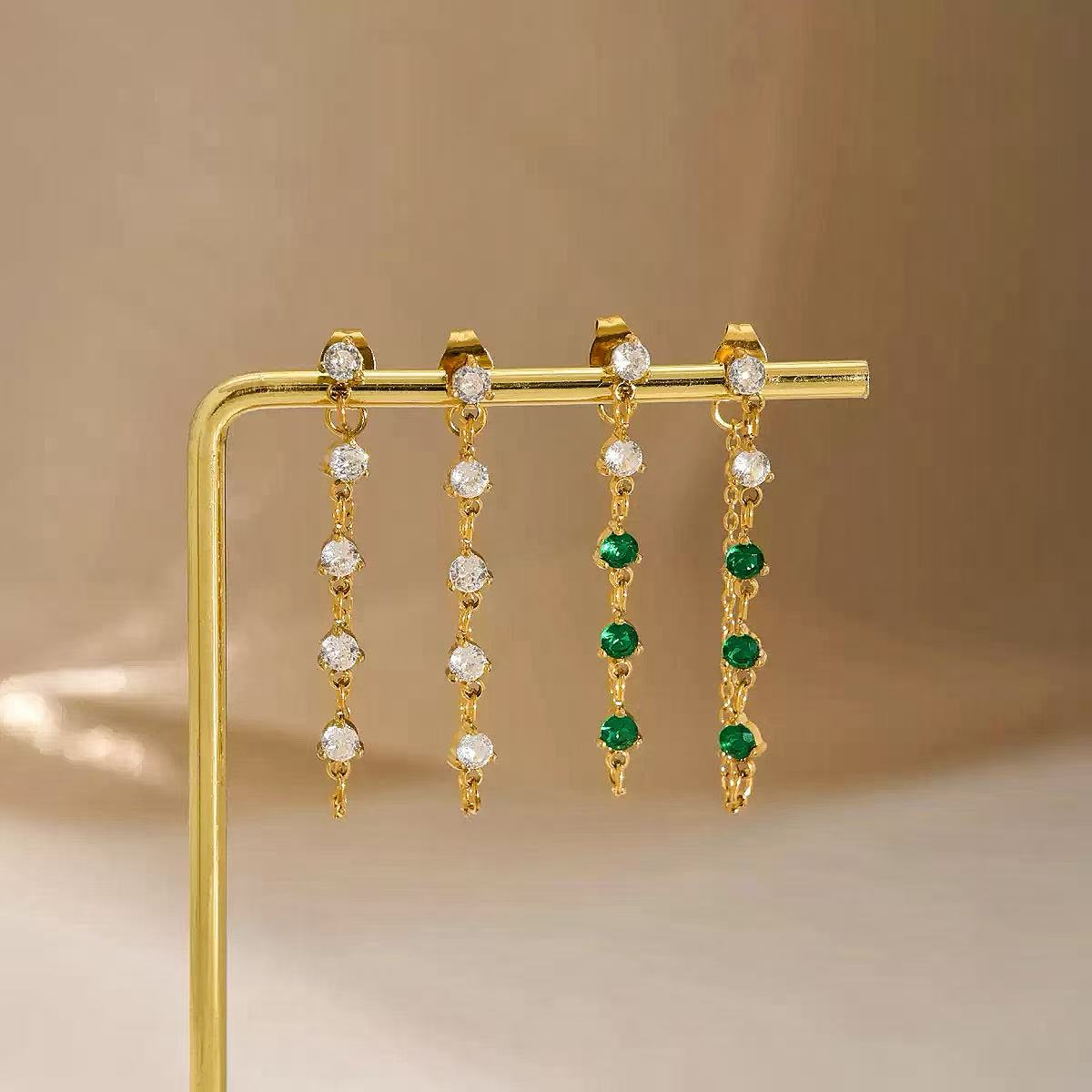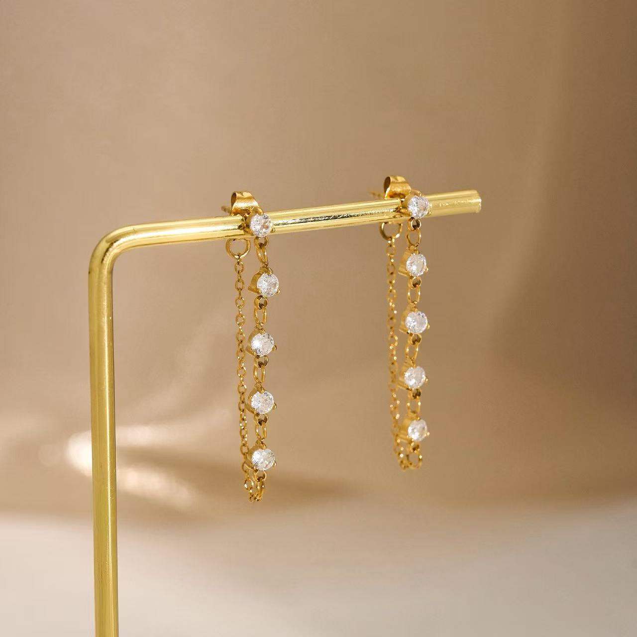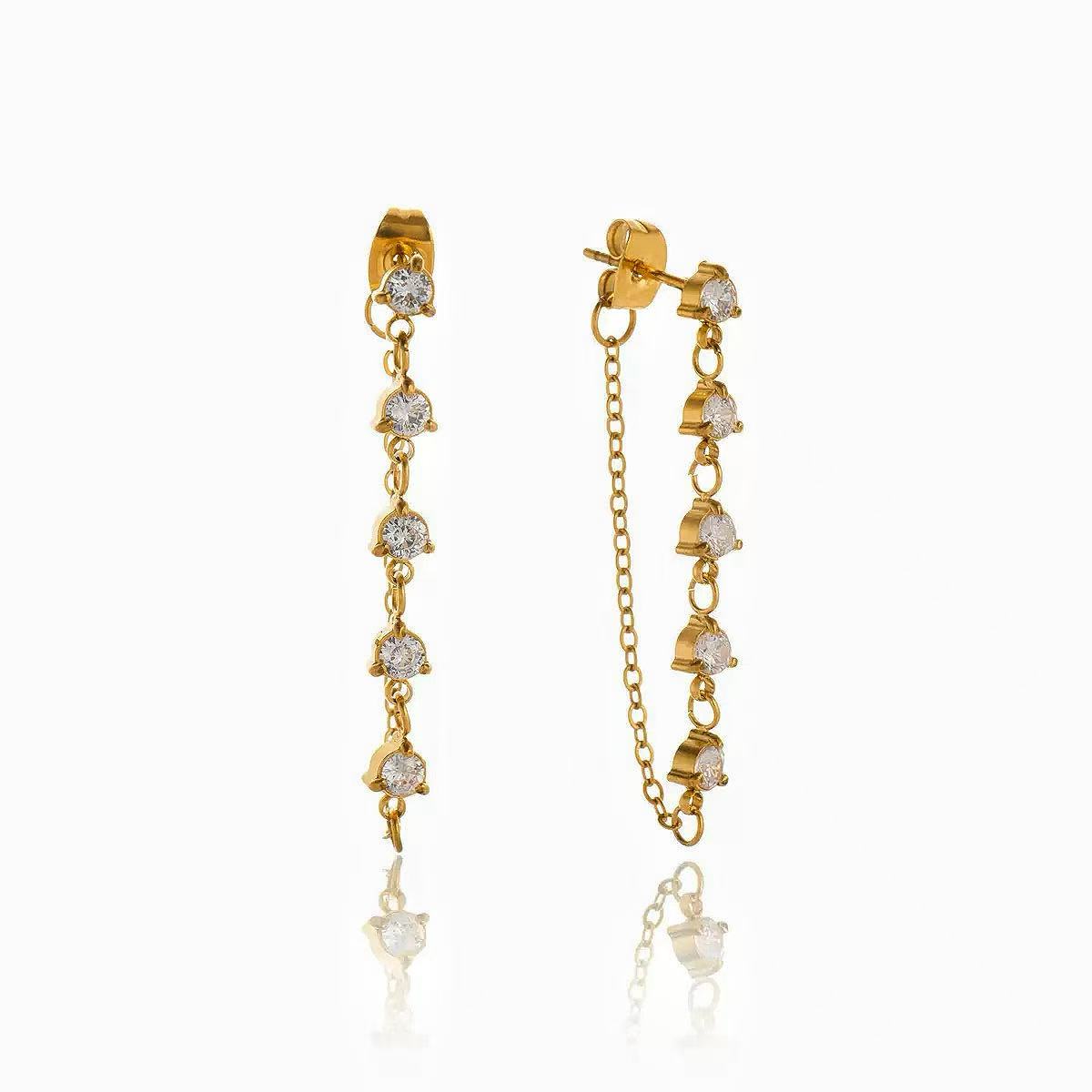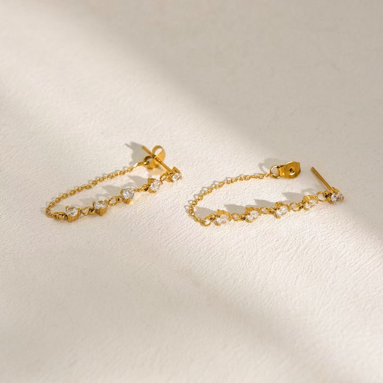 Questi orecchini pendenti presentano una linea elegante di pietre rotonde incastonate lungo una catena sottile, creando un movimento delicato e luminoso. Disponibili in due varianti, aggiungono un tocco raffinato a qualsiasi look, dal quotidiano alle occasioni speciali.