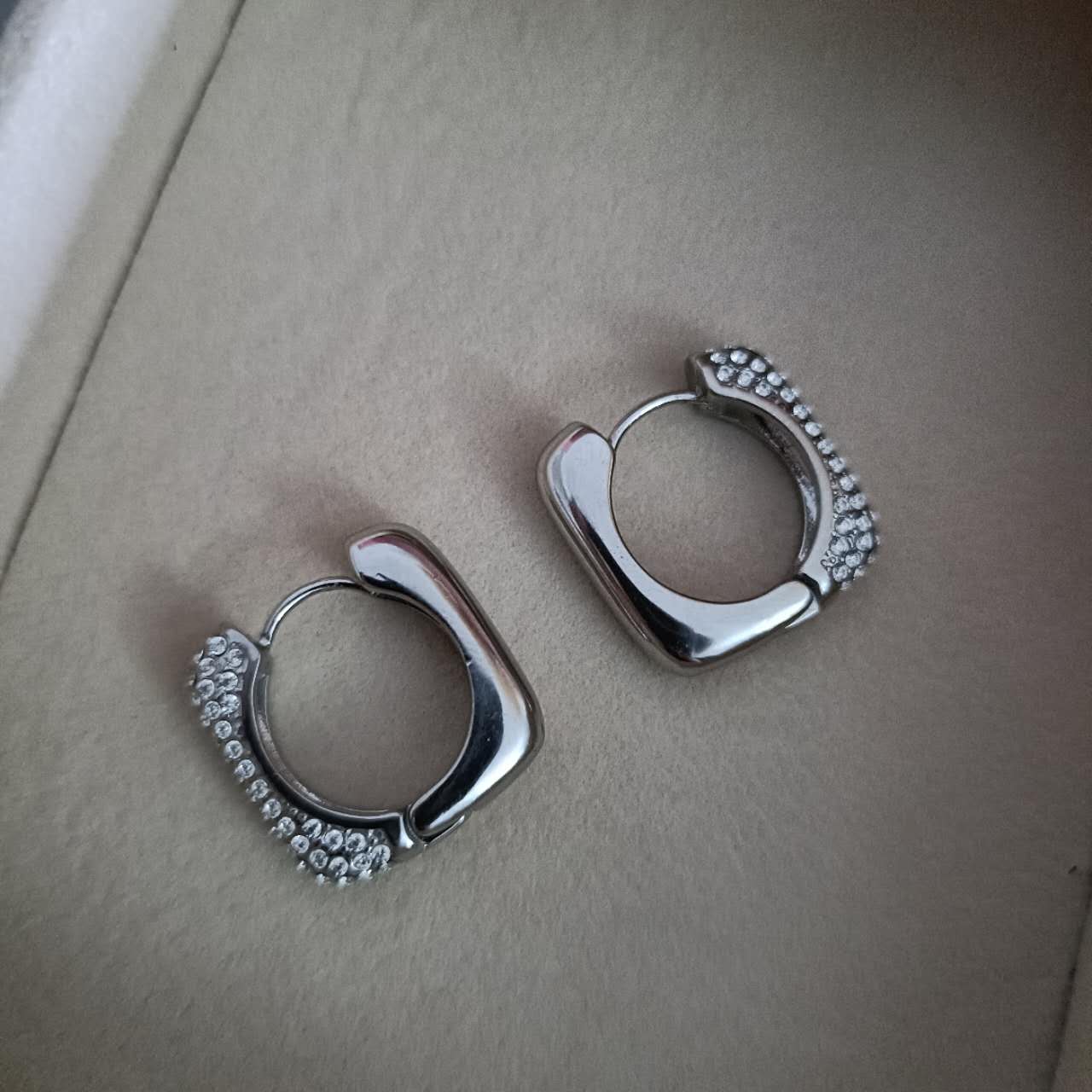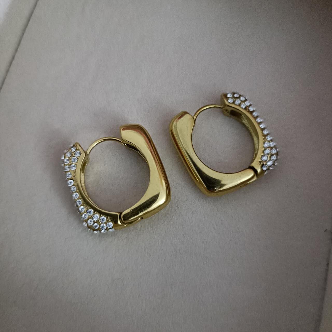 Un paio di orecchini dal design geometrico e raffinato, con una forma squadrata moderna impreziosita da una delicata fila di pietre luminose. Perfetti per chi ama l’eleganza discreta ma d’effetto.