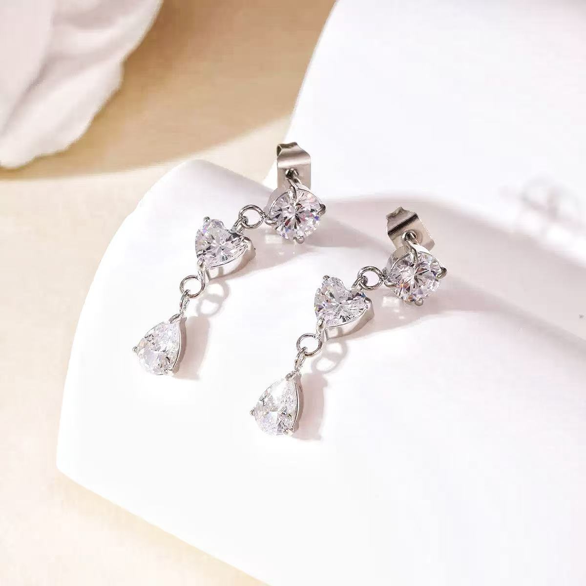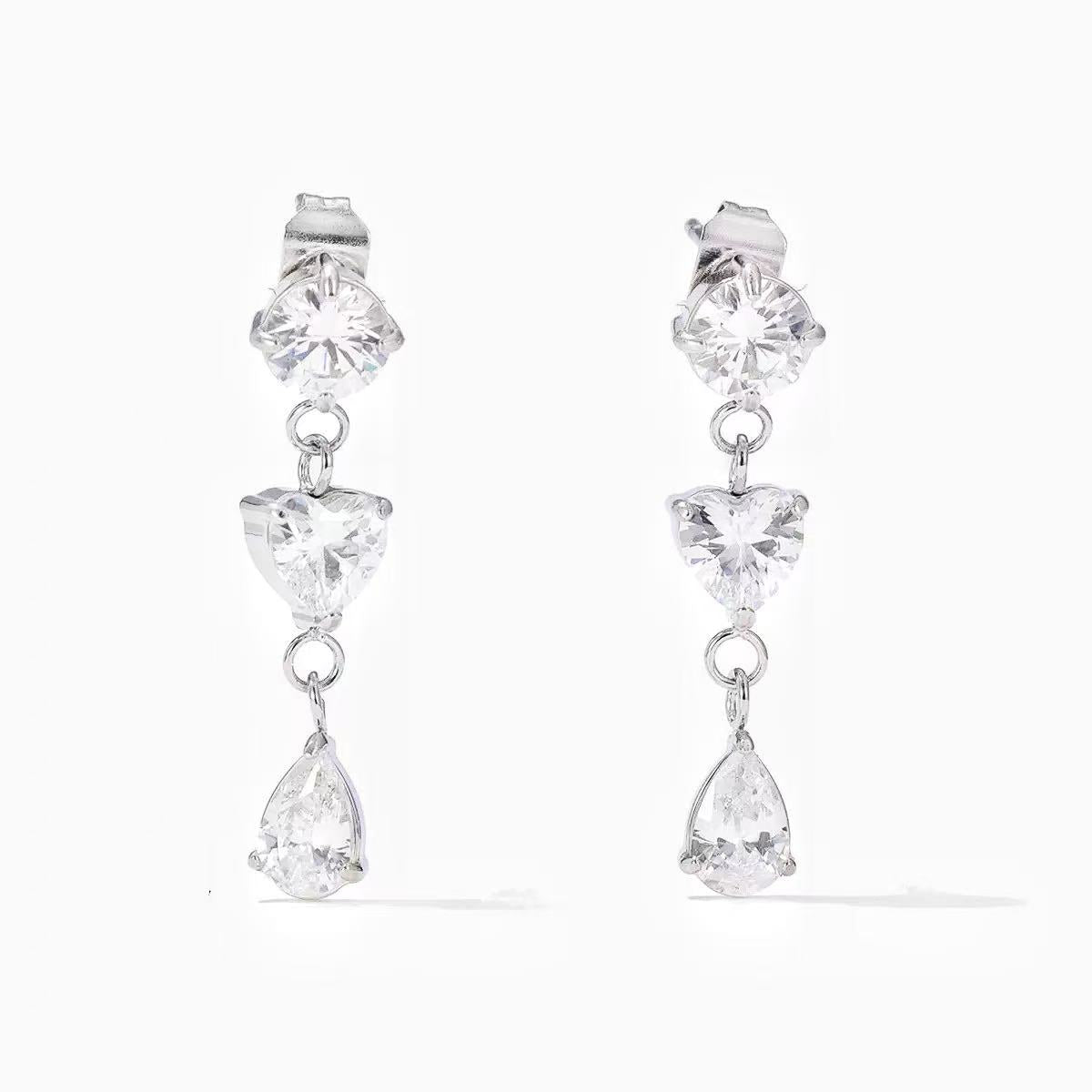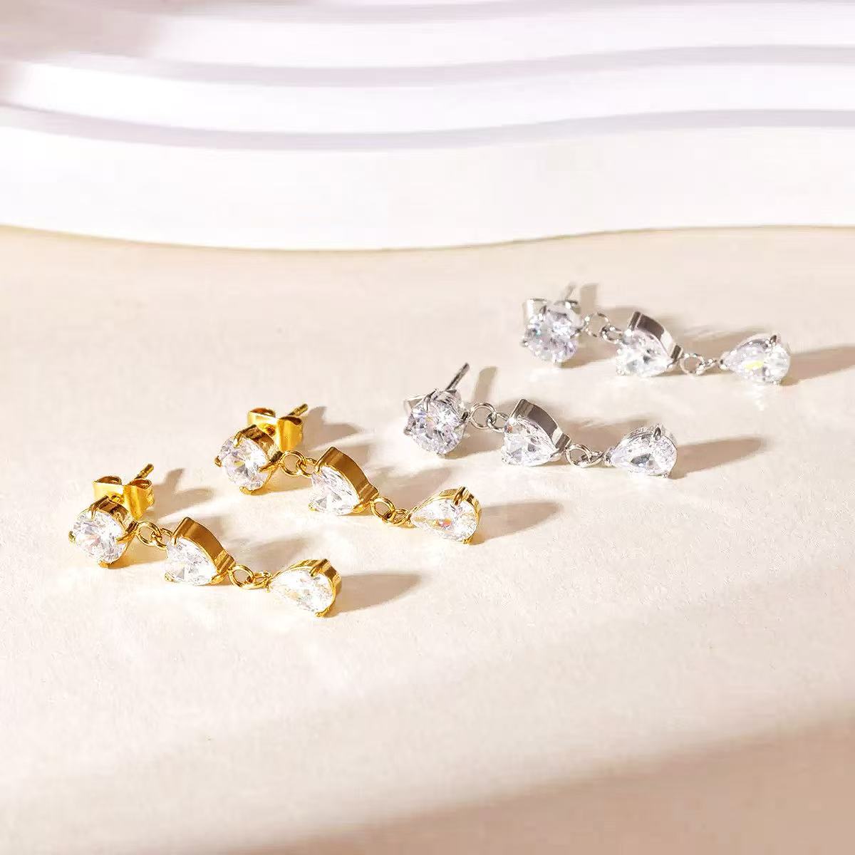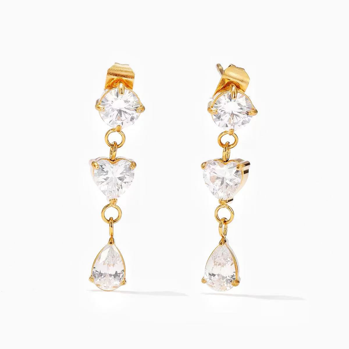 Un percorso di luce che danza ad ogni movimento. Gli orecchini Trilogia di Cristallo incantano per la loro cascata di riflessi puri e sofisticati. Il design si sviluppa verticalmente unendo tre iconici tagli di zirconi cubici: un punto luce rotondo al lobo, un romantico cuore centrale e una goccia finale che slancia la figura. La struttura in acciaio inossidabile garantisce una brillantezza inalterabile nel tempo, rendendo questo gioiello un emblema di eleganza eterna e moderna.