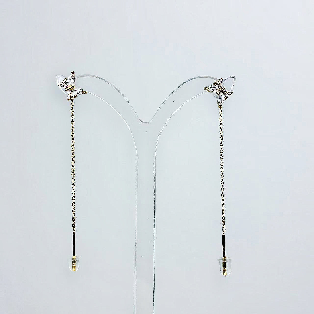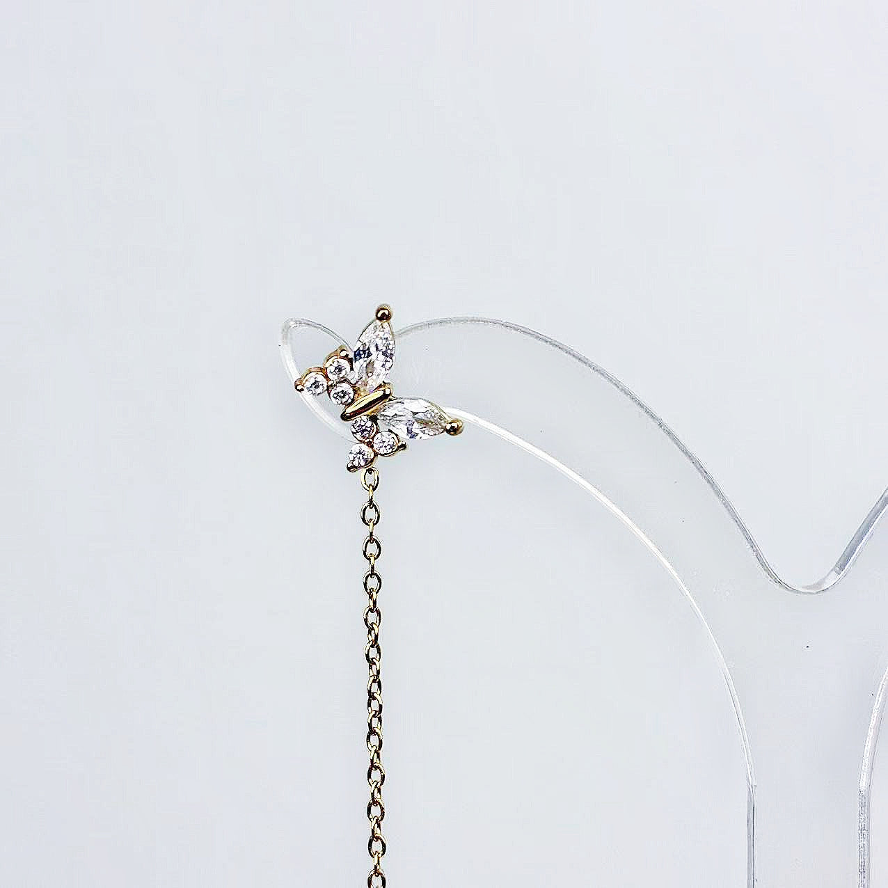 Un orecchino dal fascino poetico e raffinato, caratterizzato da un motivo ispirato alle ali di una farfalla, composto da elementi incastonati che creano una composizione armoniosa e luminosa. Il dettaglio superiore, finemente lavorato, si unisce a una catena sottile che scende con grazia, donando movimento e leggerezza all’insieme.