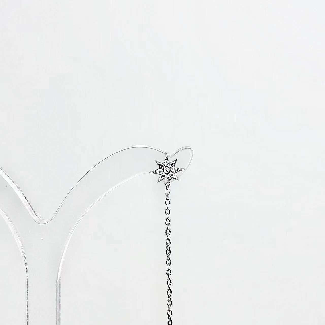 Un orecchino dal design elegante e contemporaneo, impreziosito da una stella a più punte finemente decorata che introduce una catena sottile e armoniosa. Il motivo stellare, ricco di dettagli, dona carattere e presenza, mentre la linea pendente accompagna i movimenti con naturalezza, creando un effetto leggero e sofisticato.