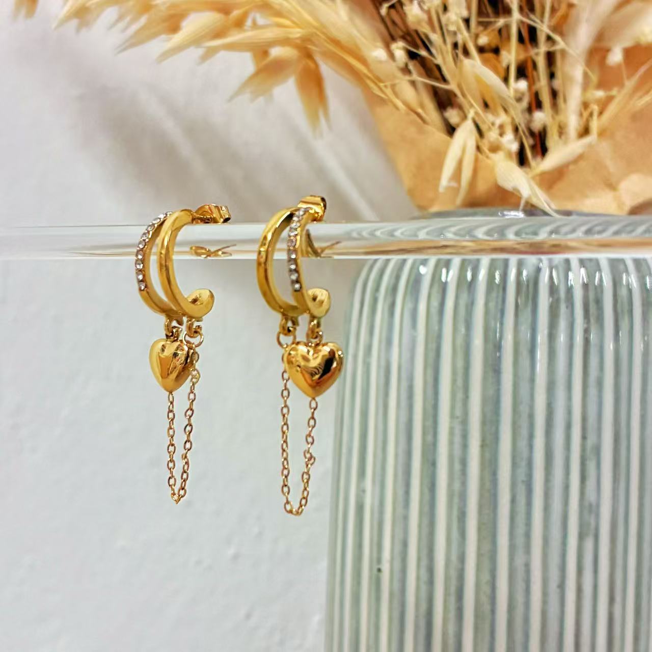Questo orecchino in acciaio inossidabile dorato unisce eleganza e dolcezza con il suo piccolo cuore pendente e i dettagli luminosi, perfetto per aggiungere un tocco romantico e raffinato al tuo look.