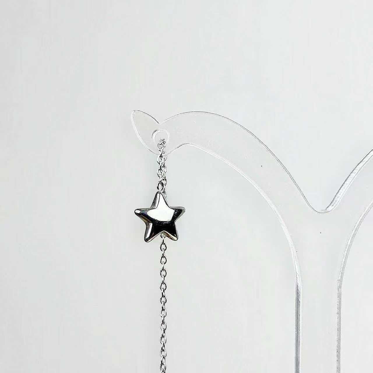 Un orecchino dal design minimale e poetico, caratterizzato da una piccola stella dalla superficie liscia che sembra fluttuare lungo una sottile catena. Il movimento delicato accompagna ogni gesto con naturalezza, creando un effetto leggero e contemporaneo che valorizza il profilo del viso senza risultare eccessivo.