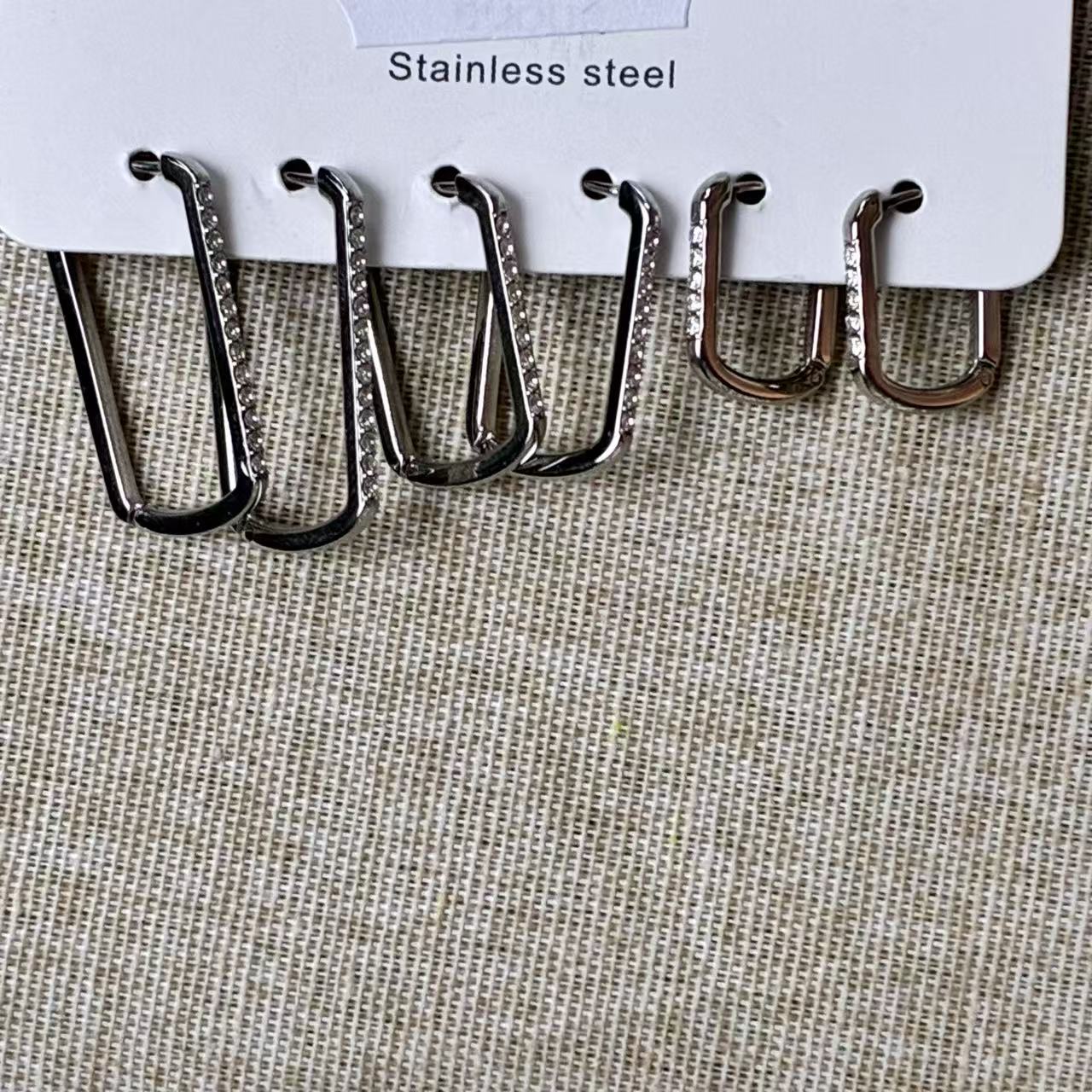 Il set Geometric Pureness è pensato per chi ama giocare con le proporzioni e lo stile "layering" sui lobi. Realizzati in acciaio inossidabile di alta qualità, questi orecchini abbandonano la classica forma tonda per abbracciare un profilo rettangolare allungato, dalle linee pulite e architettoniche. Il set offre diverse dimensioni e finiture, alternando superfici lisce e lucide a profili impreziositi da una fila di micro-cristalli incastonati, perfetti per catturare la luce a ogni movimento.